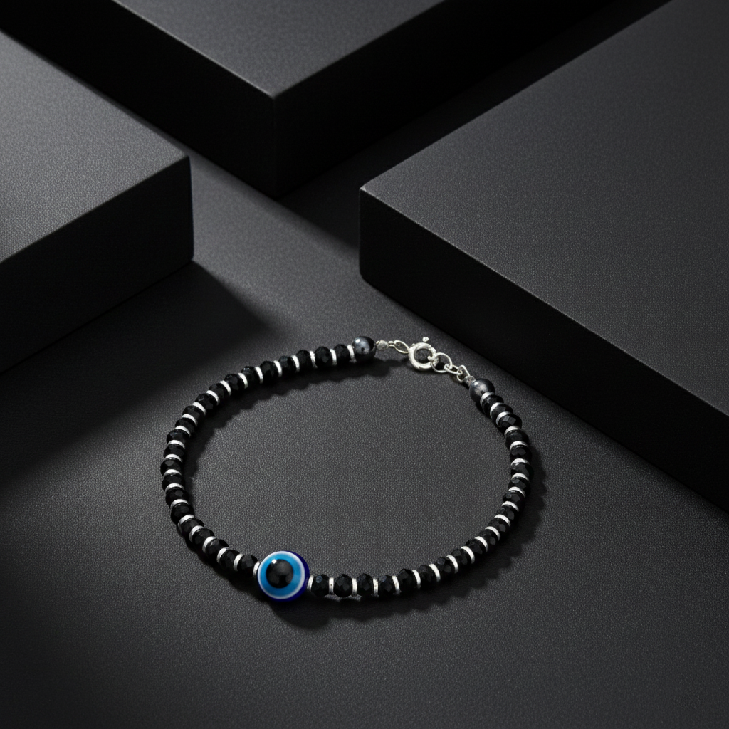 Elevate your jewelry collection with this refined 925 sterling silver bracelet, meticulously crafted with lustrous black beads and a striking blue evil eye charm. The sophisticated design combines traditional protective symbolism with contemporary elegance, featuring a secure silver spring ring clasp for everyday wear. Each bead is carefully selected to create a harmonious balance of style and meaning, making this piece an ideal accessory for those who appreciate both aesthetic beauty and spiritual significance. Perfect as a personal indulgence or a thoughtful gift for someone special.