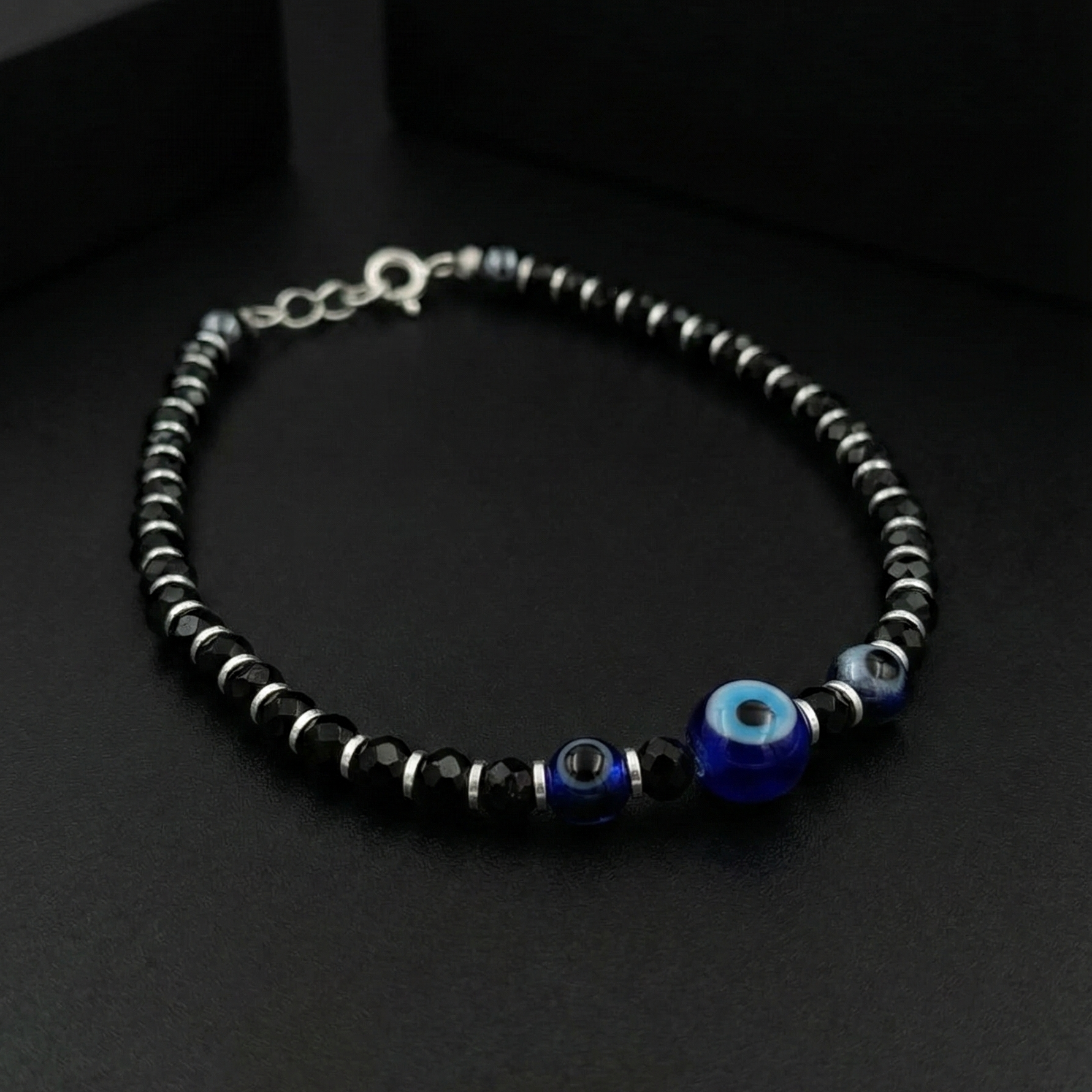Elevate your wrist with this refined sterling silver bracelet, where lustrous black onyx beads meet the protective symbolism of a striking blue evil eye charm. Meticulously crafted with 925 sterling silver components, the piece features hematite accents that add subtle depth and grounding energy. The secure spring ring clasp ensures reliable wear for daily elegance or special occasions. A sophisticated blend of natural gemstones and meaningful design, this bracelet seamlessly transitions from casual to formal settings while making a thoughtful statement about intention and style.