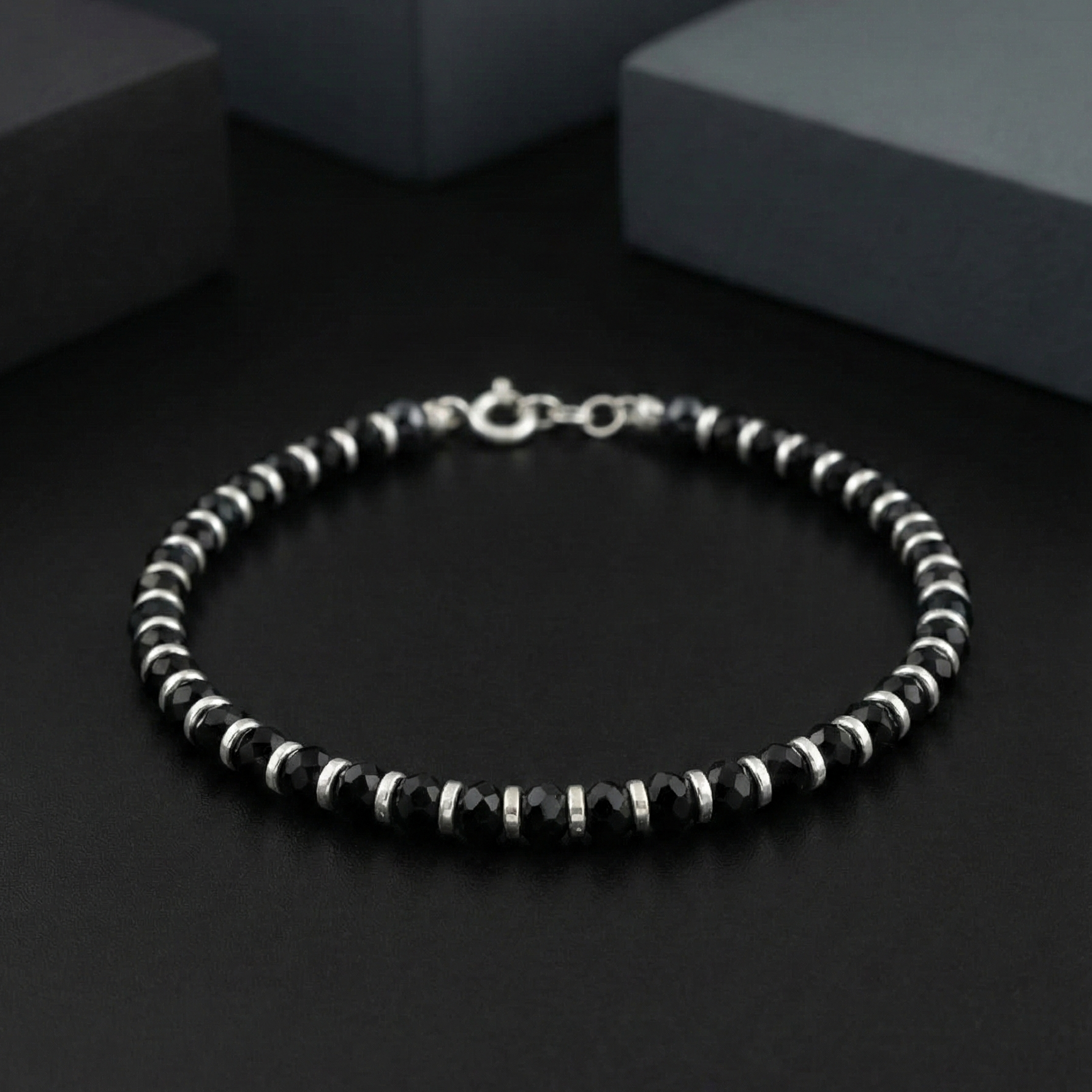 Elevate your wrist with this refined 925 sterling silver bracelet, featuring lustrous black onyx beads complemented by polished silver spacers. Each faceted gemstone catches the light with subtle brilliance, while the secure spring ring clasp ensures reliable wear. Perfect for layering or wearing solo, this sophisticated piece transitions seamlessly from day to evening, adding timeless elegance to any ensemble.