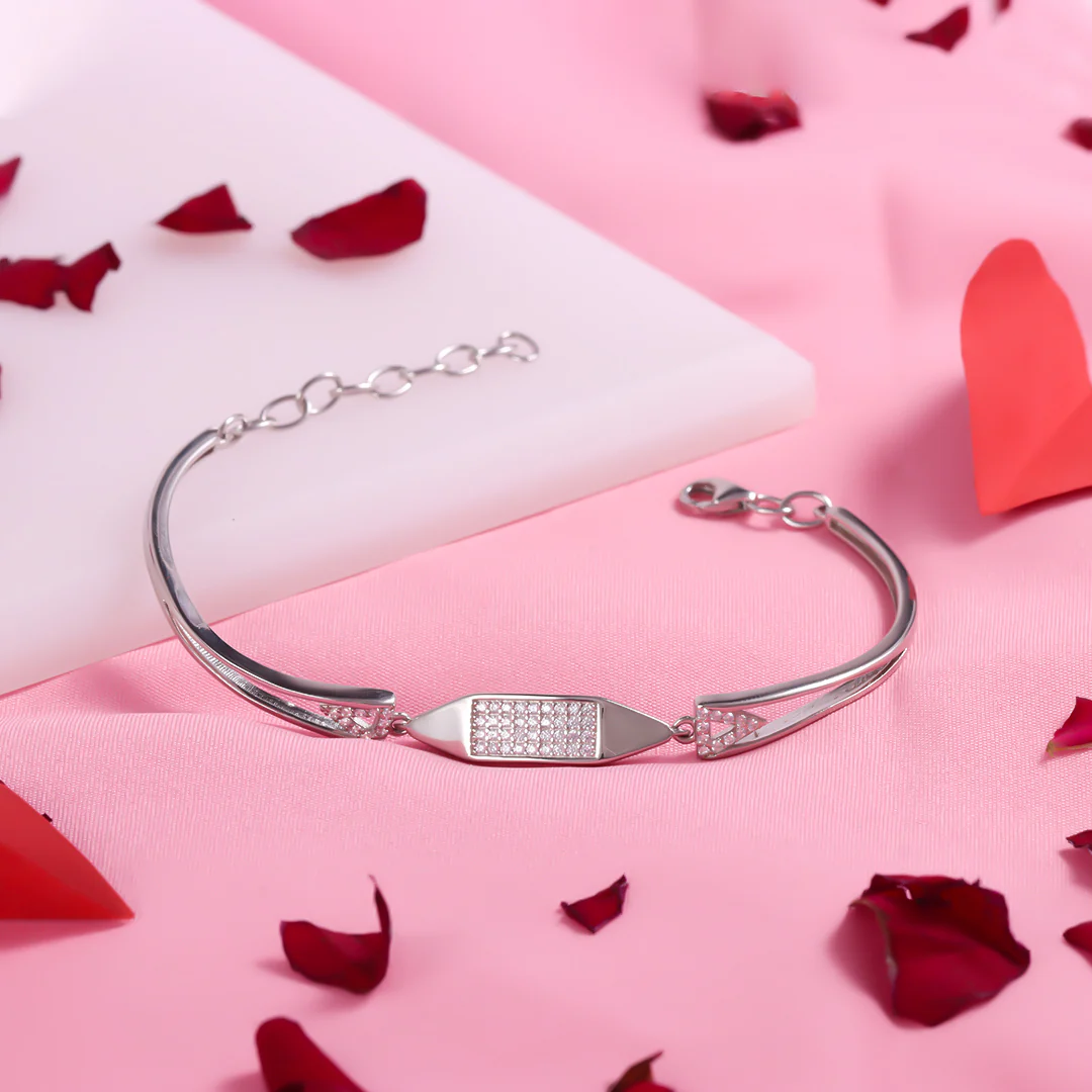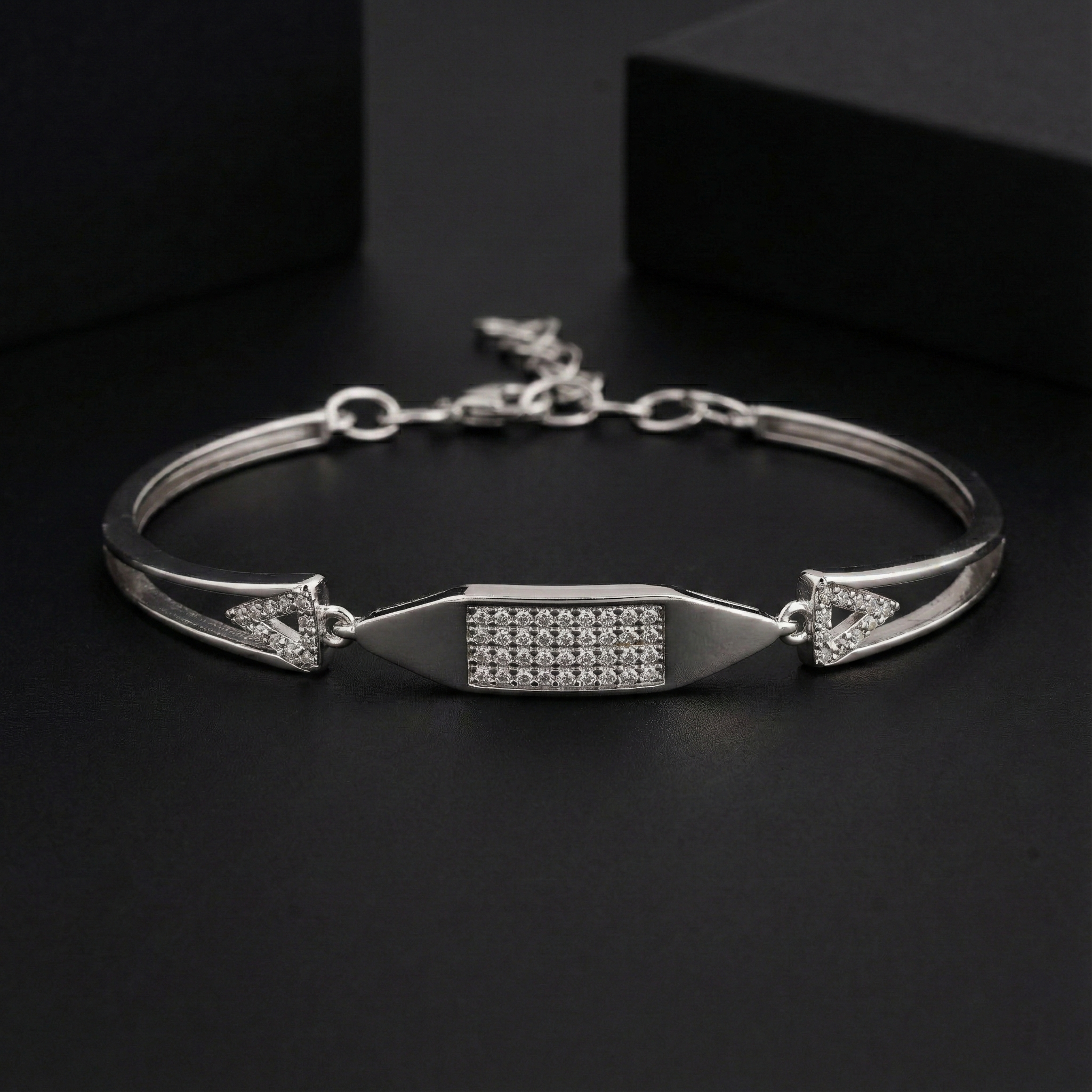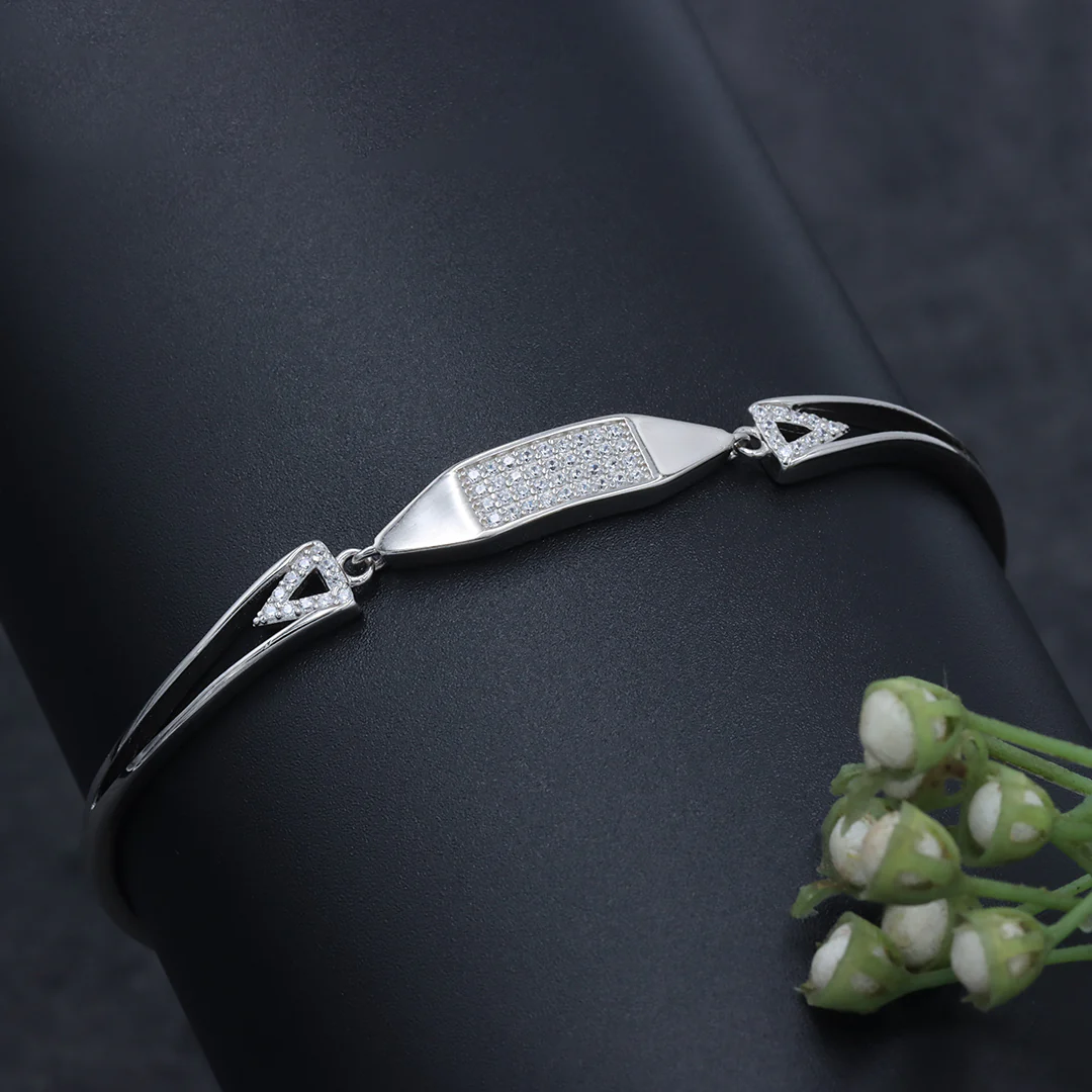 Elevate your everyday elegance with this striking 925 sterling silver bracelet, where contemporary geometry meets timeless craftsmanship. The minimalist bar and triangle accents create a modern aesthetic that seamlessly transitions from office to evening wear. Crafted from premium starling silver, this bangle offers both durability and lustrous appeal. The adjustable sizing ensures a perfect fit for any wrist, making it an ideal gift or personal treasure. A sophisticated statement piece that celebrates refined design and quality materials.