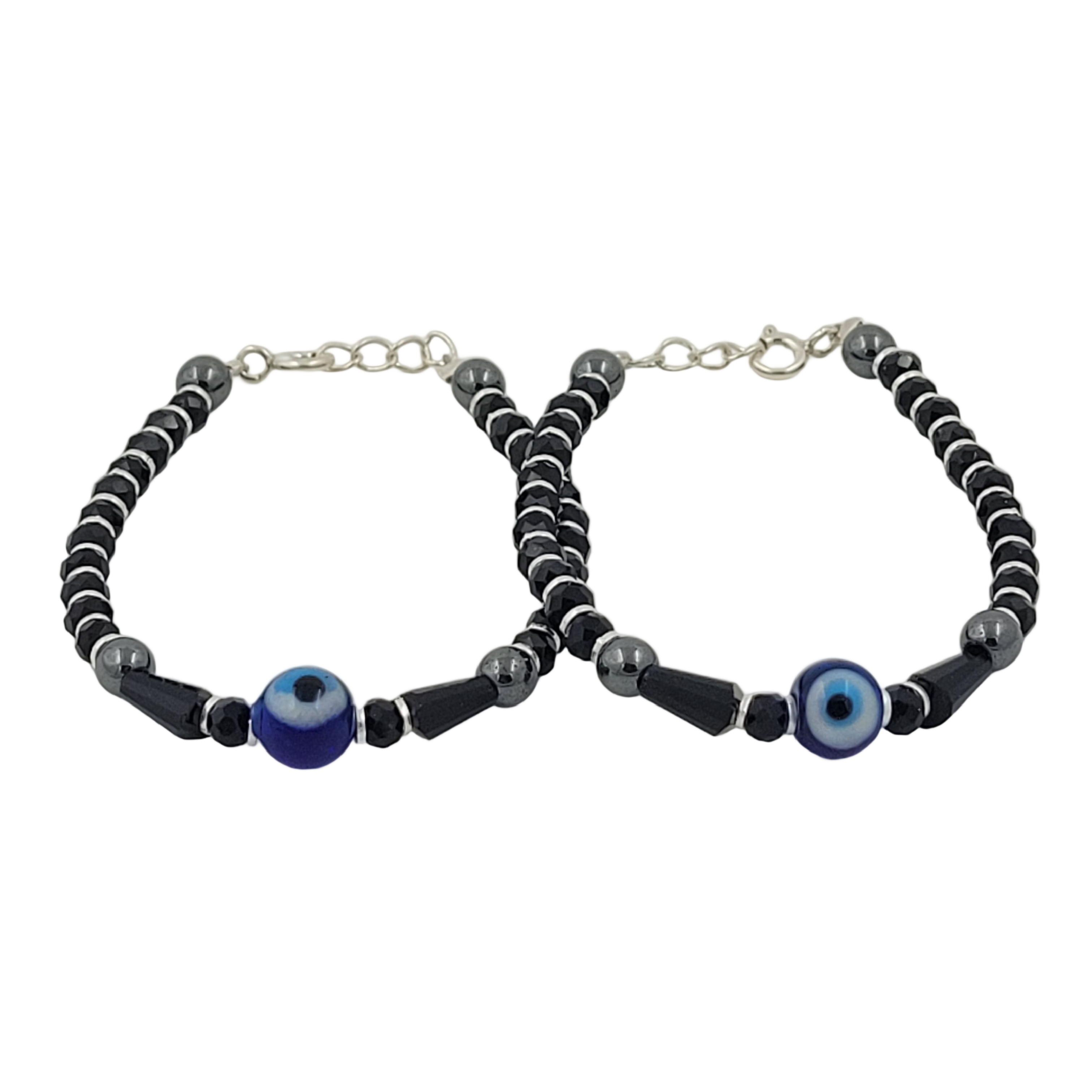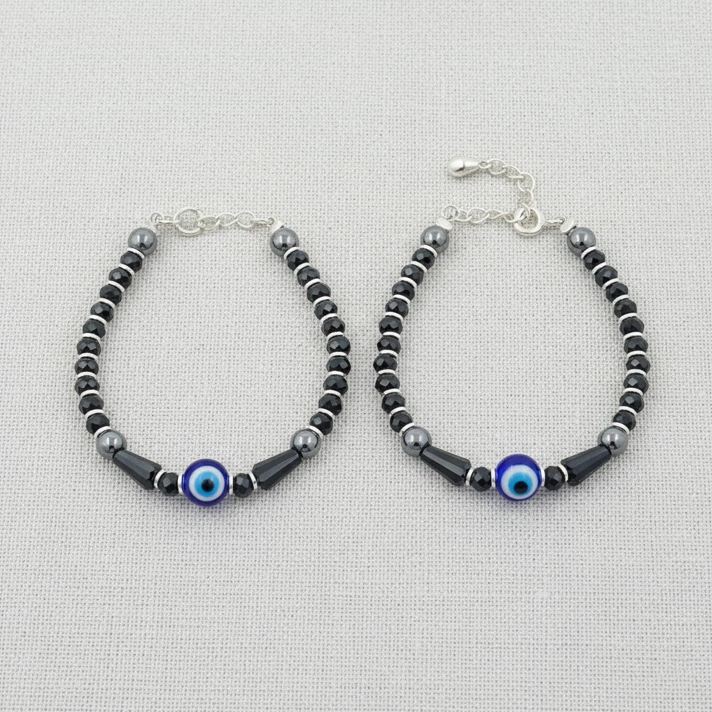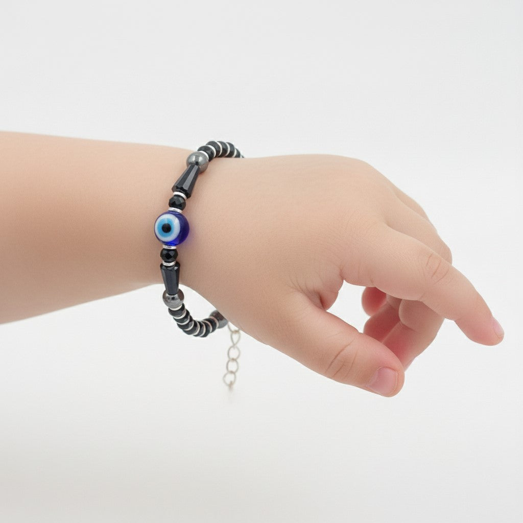 Protect your child with this exquisite handcrafted nazariya, meticulously designed to ward off negative energy. Crafted from sterling silver and adorned with lustrous hematite stones, this piece combines traditional protective symbolism with contemporary elegance. The striking black and silver glass beads frame a captivating blue evil eye centerpiece, creating a powerful amulet that serves as both spiritual safeguard and refined accessory. Perfect for children seeking meaningful jewelry that honors cultural heritage while delivering timeless style and protection.