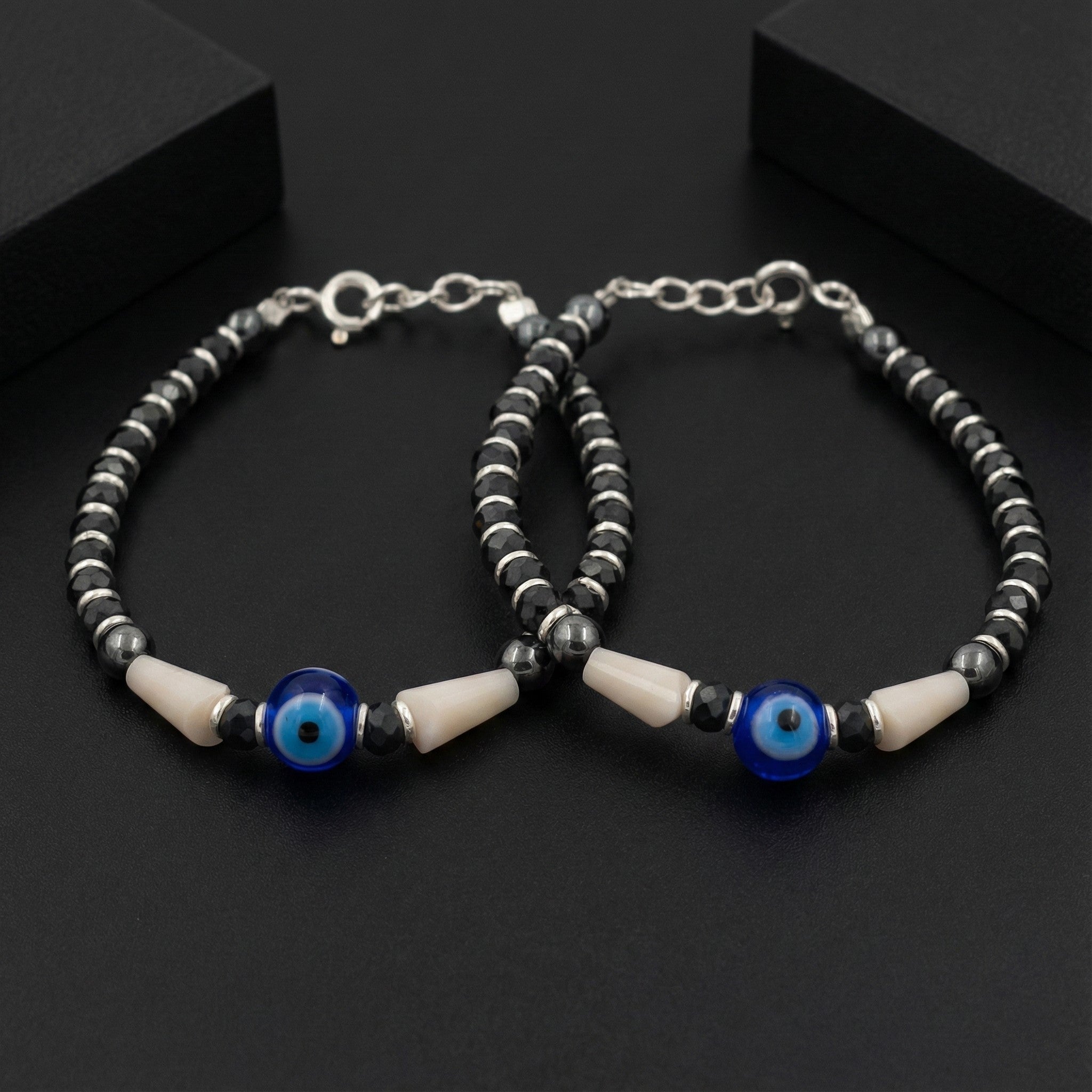 Embrace timeless spiritual protection with this exquisite 925 sterling silver Evil Eye Nazariya bracelet. Meticulously crafted with lustrous black crystal beads and a striking blue glass eye pendant, this piece combines traditional symbolism with contemporary elegance. Hematite pearl accents add depth and refinement, creating a sophisticated accessory that transcends mere adornment. Whether worn as a personal talisman or cherished gift, this bracelet serves as a beautiful reminder of ancient protective traditions while complementing any refined wardrobe.
