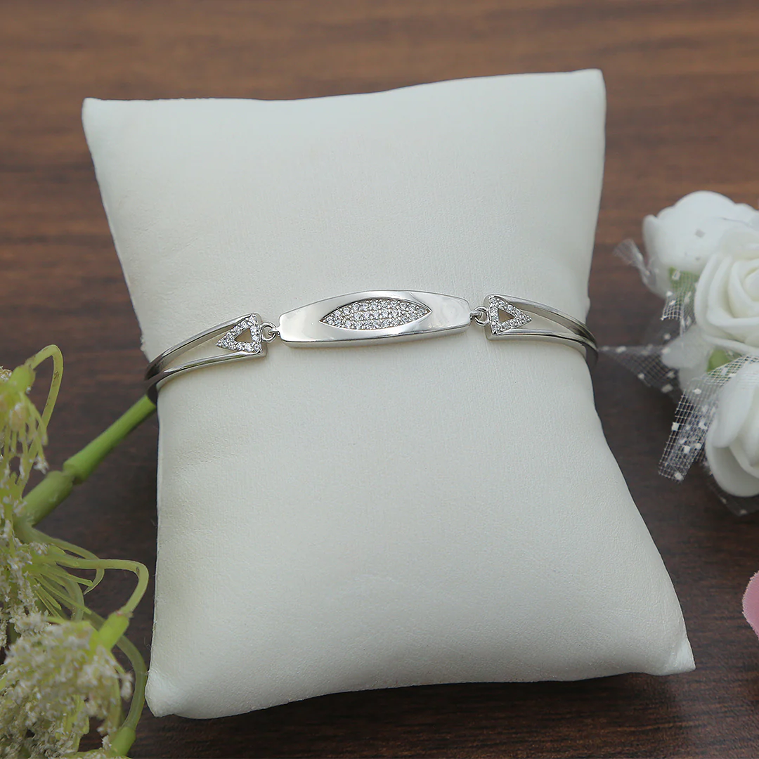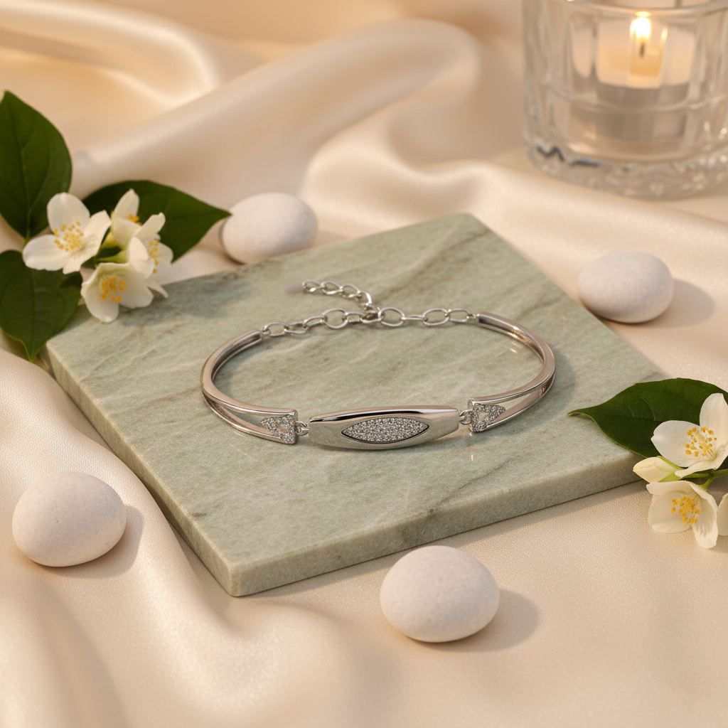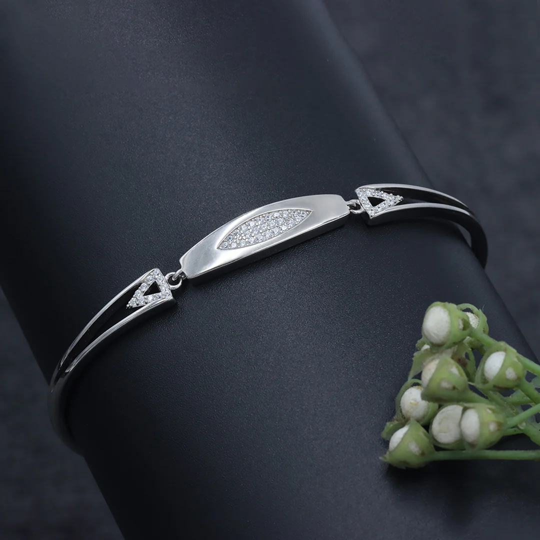 Add a touch of structured elegance to your wrist stack with this Geometric Bar Bracelet. This modern piece features a polished rectangular center bar detailed with a sparkling chevron (arrow) pattern, framing a sleek hexagonal centerpiece. The semi-rigid cuff arms are embellished with a row of pavé-set stones, offering a continuous line of shimmer.