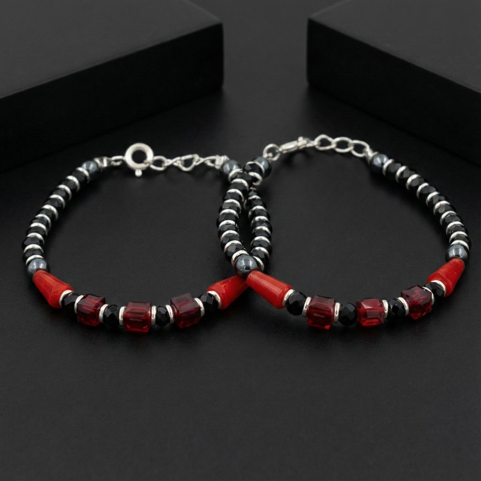 Protect your child with timeless elegance. This handcrafted nazariya combines 925 sterling silver with striking black and red crystal glass beads, creating a sophisticated protective charm. Delicate silver metal accents enhance the design, making it both a meaningful spiritual accessory and a stunning statement piece. Perfect for special occasions or everyday wear, this beaded treasure blends traditional craftsmanship with contemporary style.