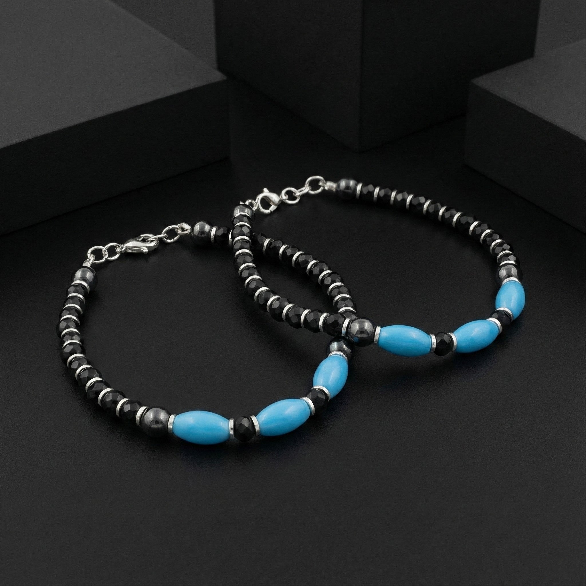 Protect your child with timeless elegance. This handcrafted nazariya combines 925 sterling silver with carefully selected gemstones—hematite grey beads, vibrant turquoise accents, and navy crystal spacers—creating a piece that's both spiritually meaningful and visually striking. Each bead is thoughtfully arranged to balance protection with refined aesthetics, making it an ideal accessory for daily wear or special occasions. A sophisticated choice for parents seeking quality craftsmanship and cultural significance.