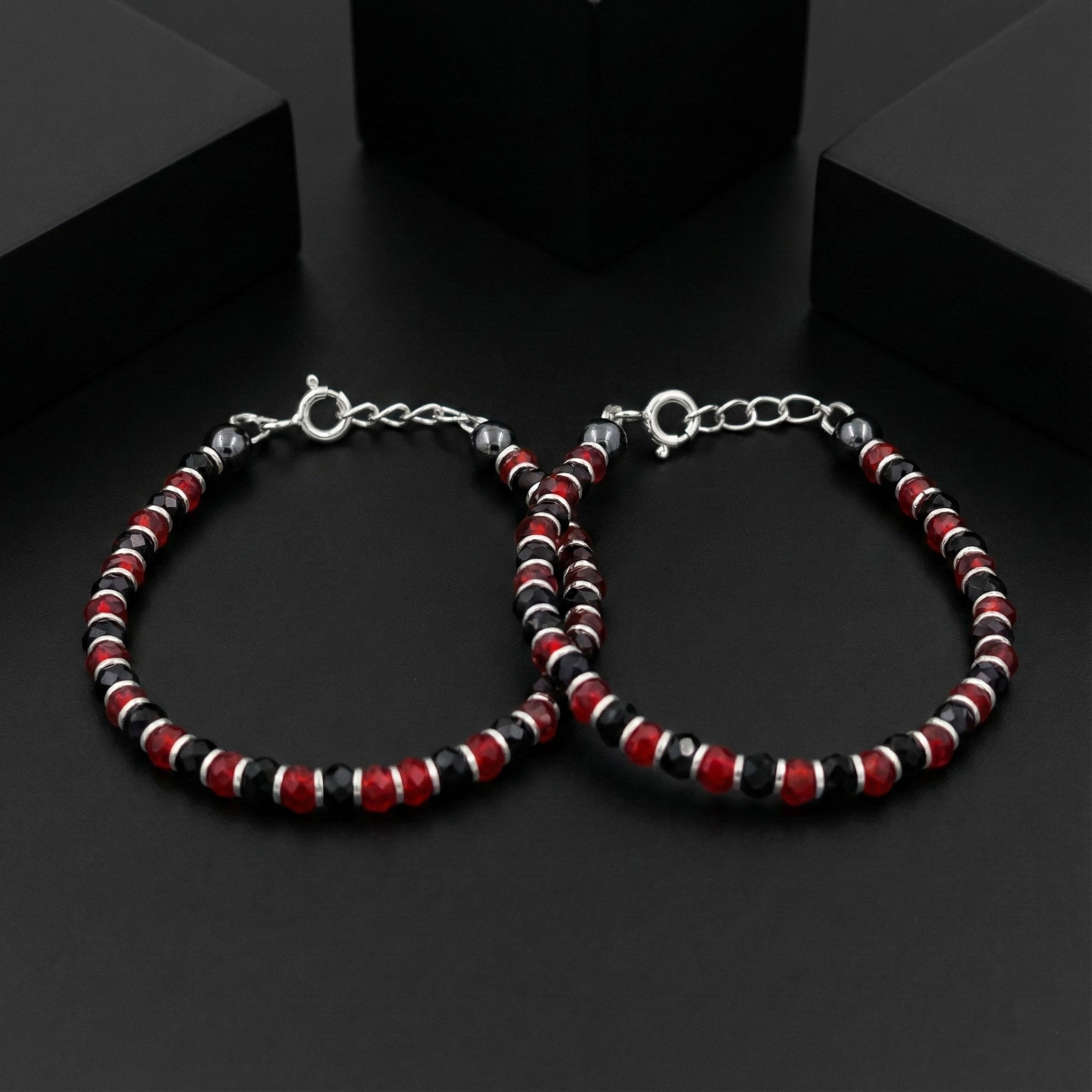 Protect your child with timeless tradition. This exquisite kids' nazariya features handcrafted 925 sterling silver accents paired with vibrant red and black crystal beads, creating a striking protective charm. Each glass bead is carefully selected for its lustrous quality and rich color saturation. Designed specifically for young wearers, this piece combines cultural significance with contemporary craftsmanship. The delicate construction ensures comfort during daily wear, while the sophisticated color palette complements any outfit. A meaningful gift that honors heritage while keeping your little one safe and stylish.