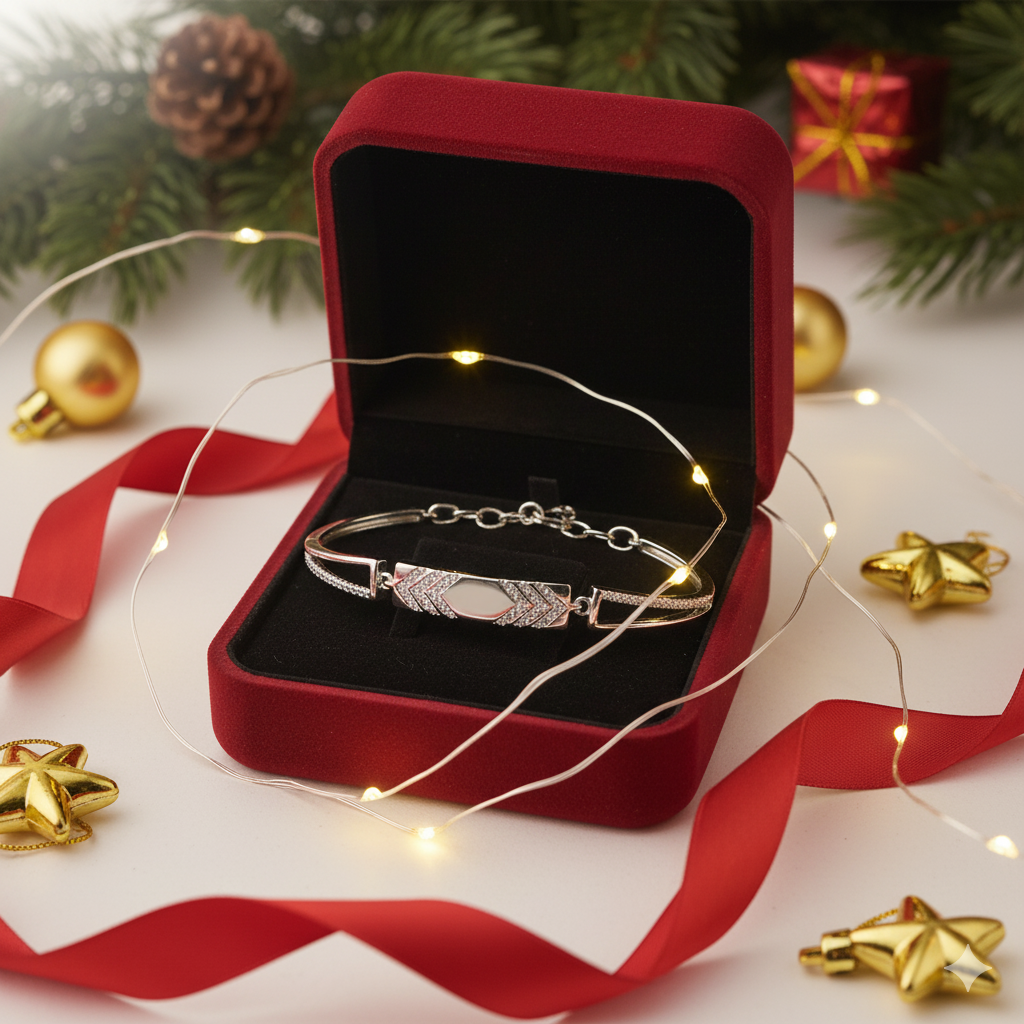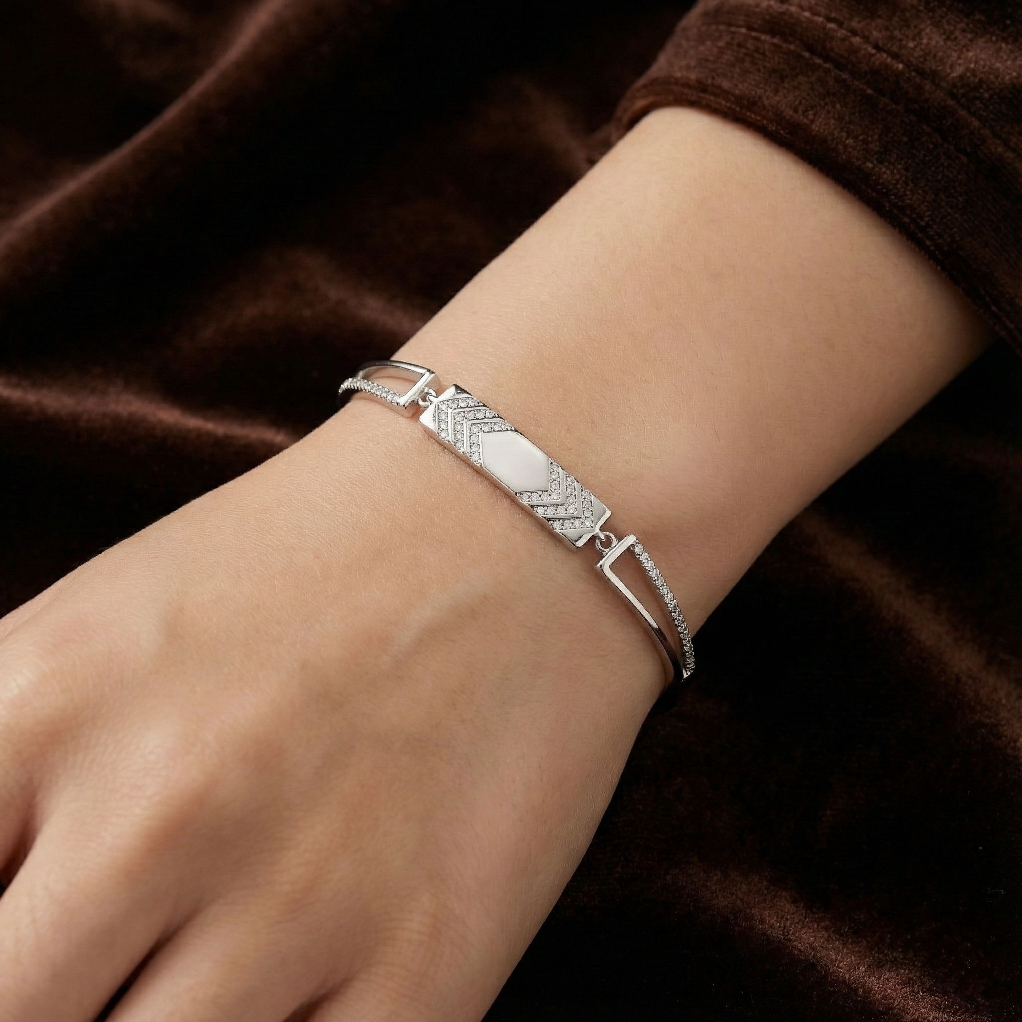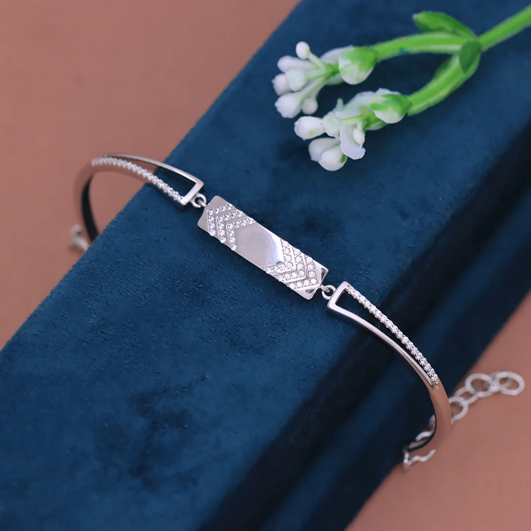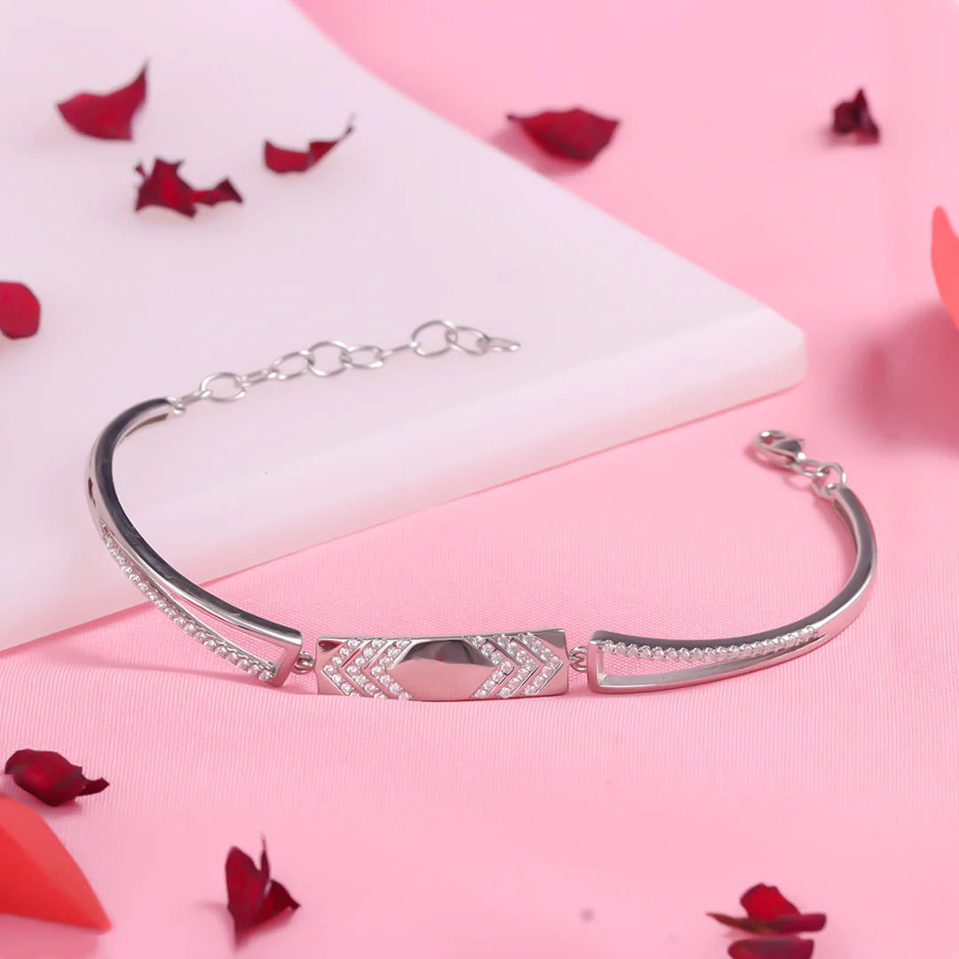 The focal point is a polished rectangular bar adorned with a striking chevron pattern of sparkling stones (Cubic Zirconia), framing a smooth hexagonal center. The split-shank arms are lined with a row of micro-pave stones, adding a continuous line of shimmer to your wrist. Finished in a lustrous silver tone, this bracelet is perfect for wearing solo or stacking with your favorite watch.