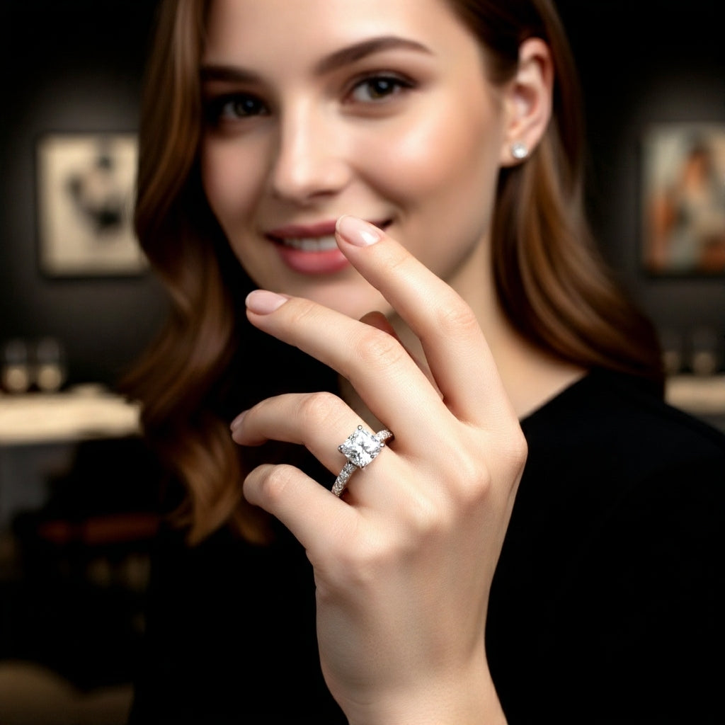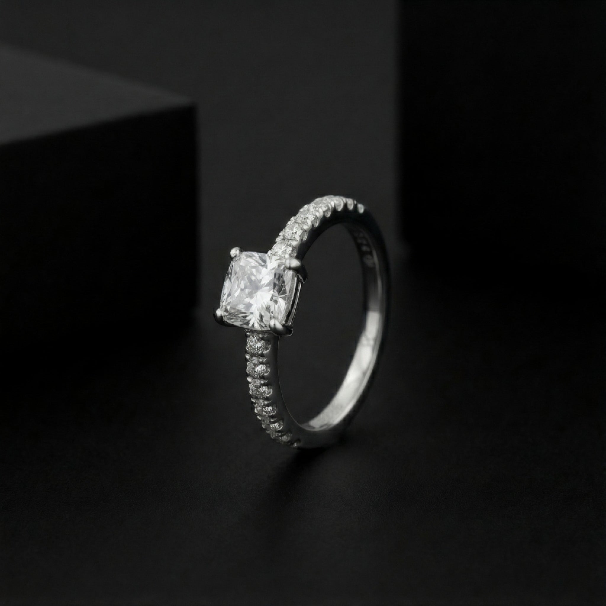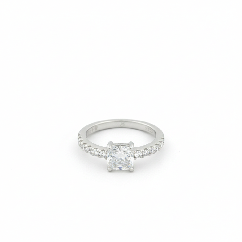 Elevate your engagement with timeless elegance. This 925 sterling silver ring features a stunning cushion cut solitaire stone that captures light beautifully, complemented by a delicate pavé band adorned with sparkling accents. Crafted with precision and refined taste, this piece balances classic sophistication with contemporary design. Perfect for those who appreciate understated luxury and enduring beauty. A meaningful symbol of commitment that transcends trends.