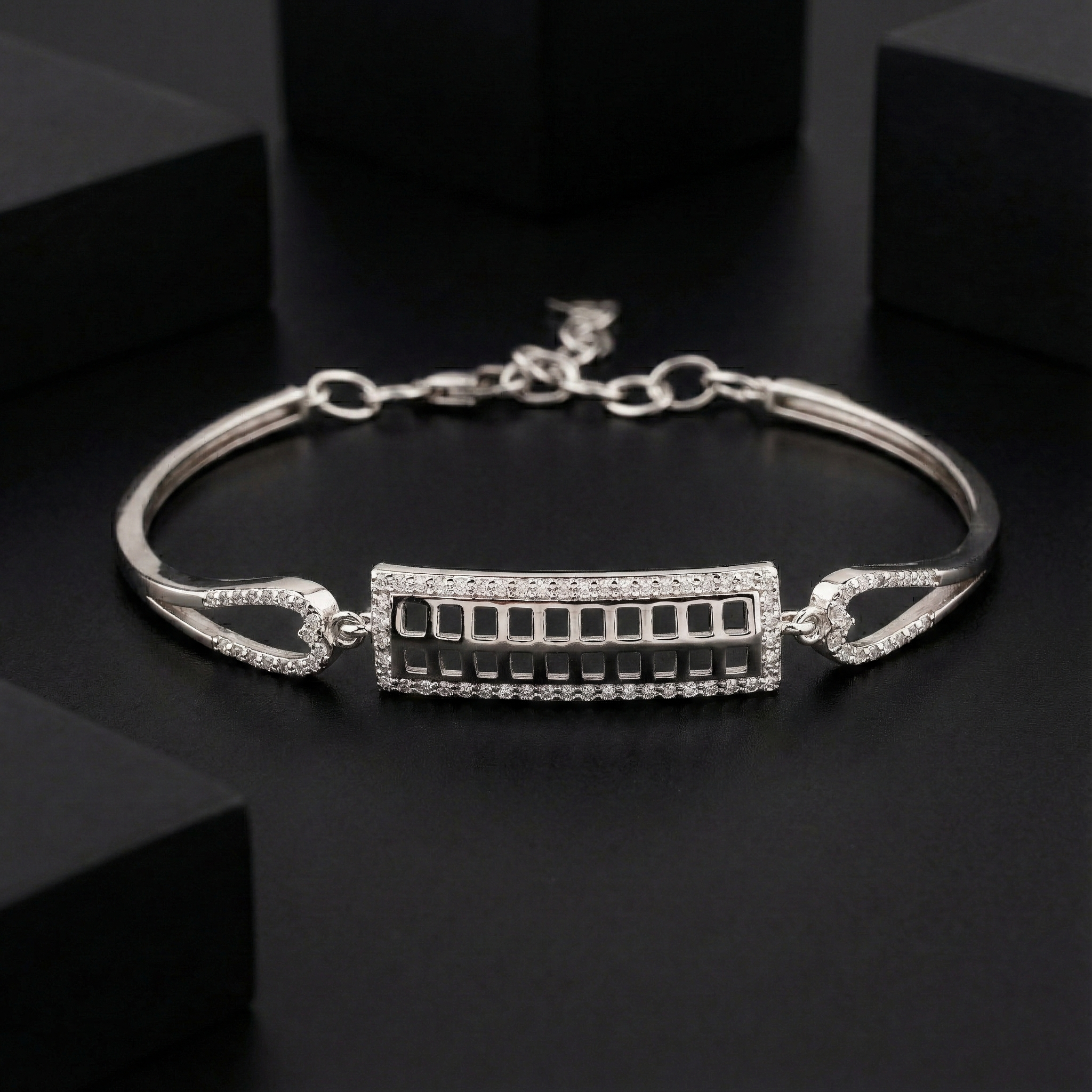 Elevate your everyday elegance with this striking 925 sterling silver bracelet, where contemporary geometry meets timeless craftsmanship. The intricate grid pattern creates visual depth and movement, while the sparkling cubic zirconia border adds a refined touch of luminosity. Perfect for those who appreciate understated luxury, this modern minimal design transitions seamlessly from office to evening, making it an essential addition to any discerning jewellery collection.