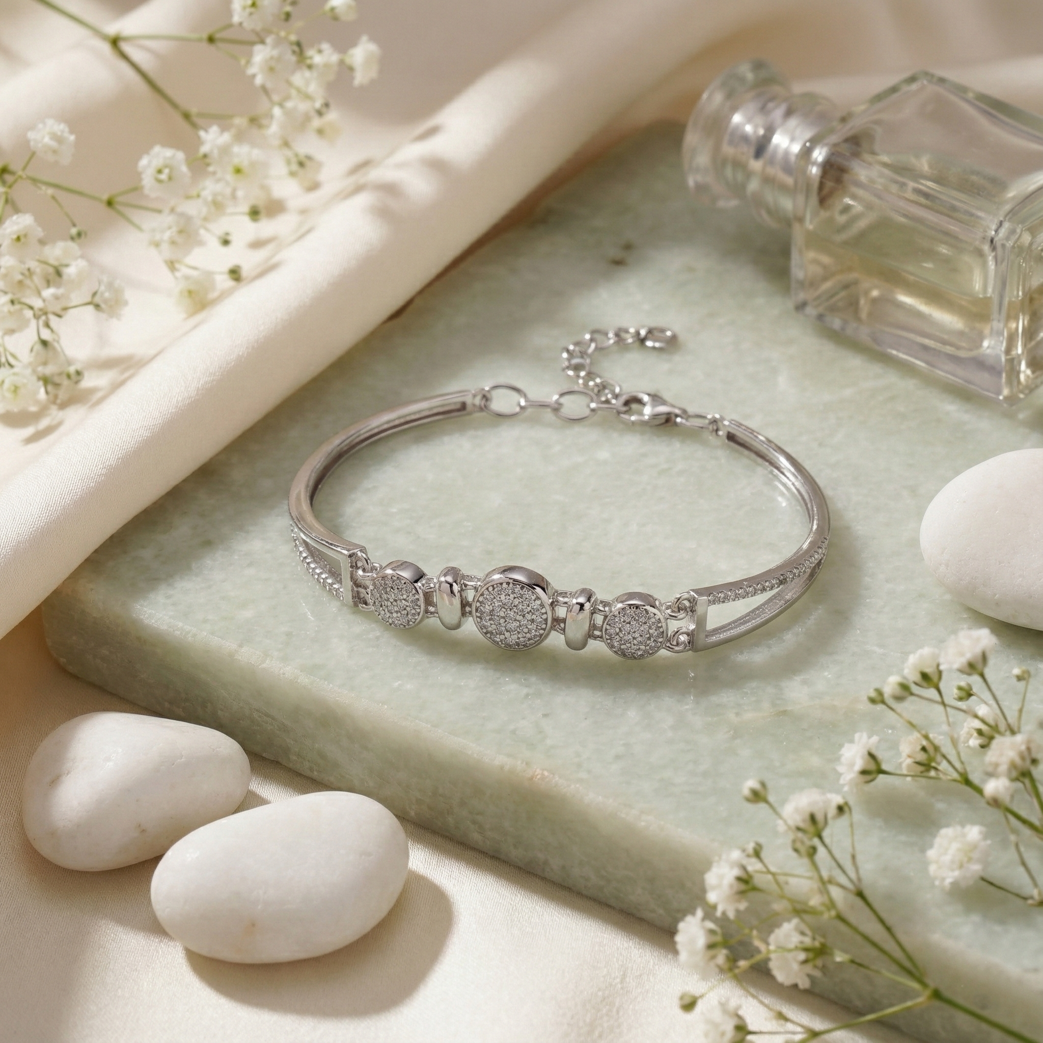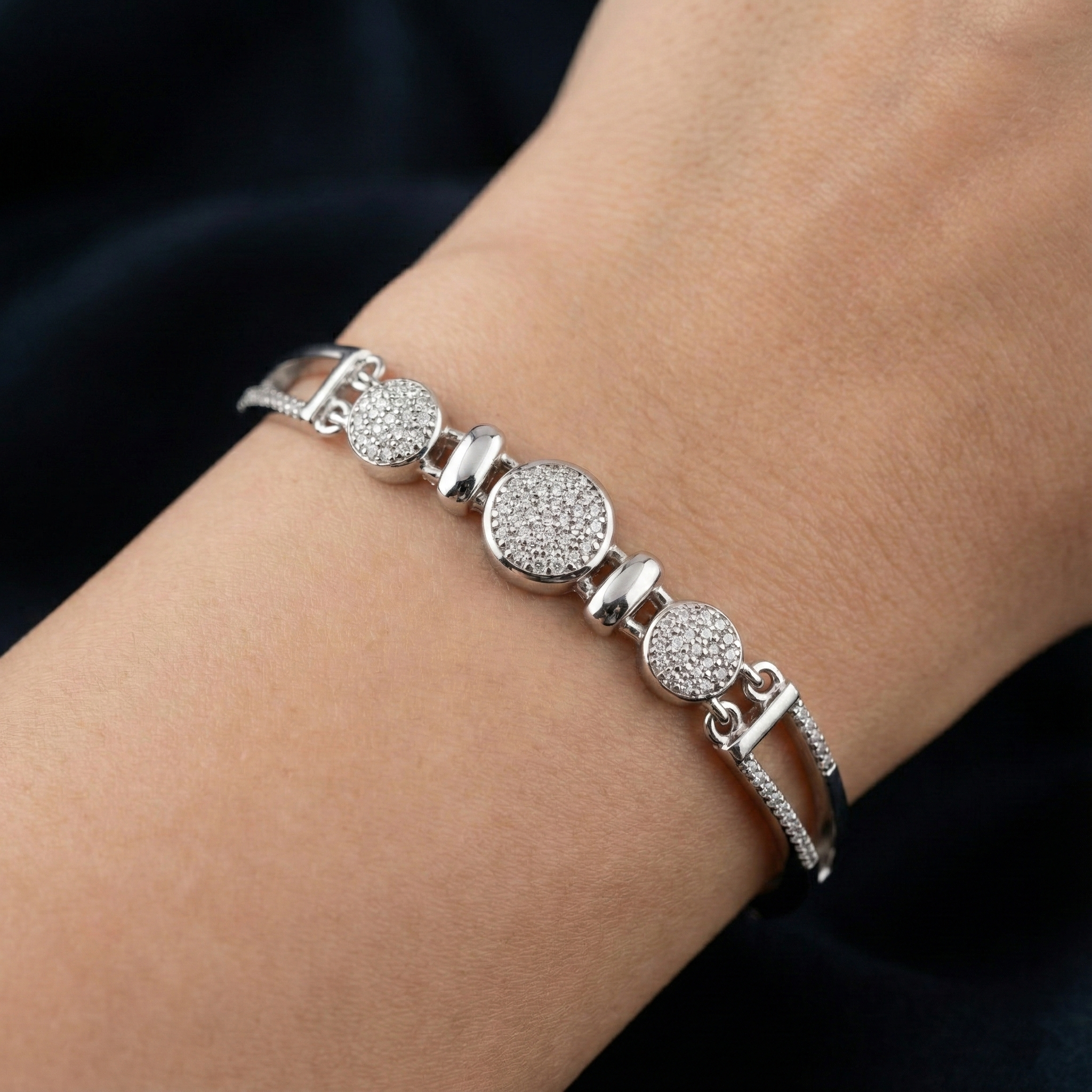 Elevate your wrist with this refined sterling silver bracelet, where contemporary geometry meets timeless elegance. Crafted from 925 sterling silver, each link features intricate pave cubic zirconia detailing that catches light beautifully, complemented by polished accents for a sophisticated finish. The adjustable fit ensures comfort for any occasion, from everyday wear to special events. A versatile piece that seamlessly transitions between casual and formal settings, this bracelet makes a striking statement while maintaining understated luxury.