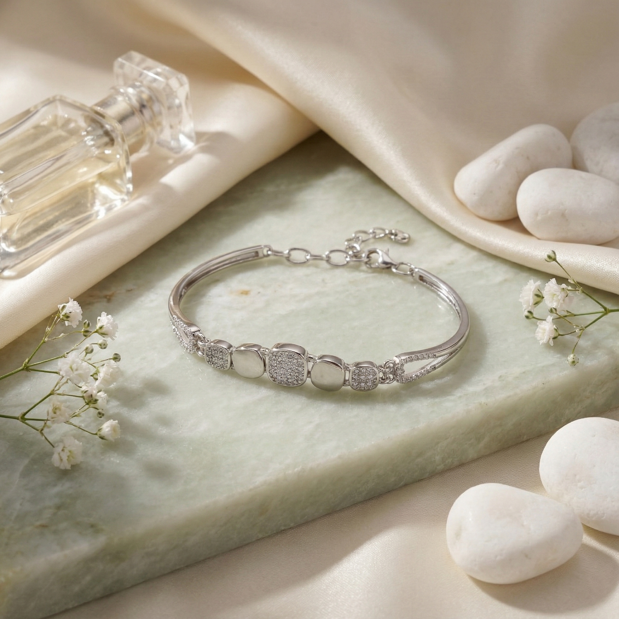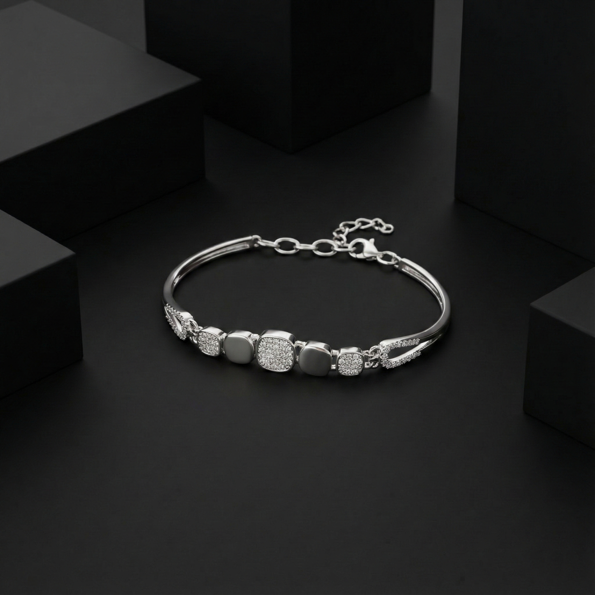 Elevate your wrist with this striking 925 sterling silver bracelet, where contemporary geometry meets timeless elegance. Featuring interlocking geometric links adorned with pavé cubic zirconia stones and polished silver accents, this piece captures light beautifully with every movement. The adjustable fit ensures comfort for all wrist sizes, making it versatile enough for everyday wear or special occasions. A sophisticated addition to any jewelry collection that seamlessly transitions from casual to formal settings.