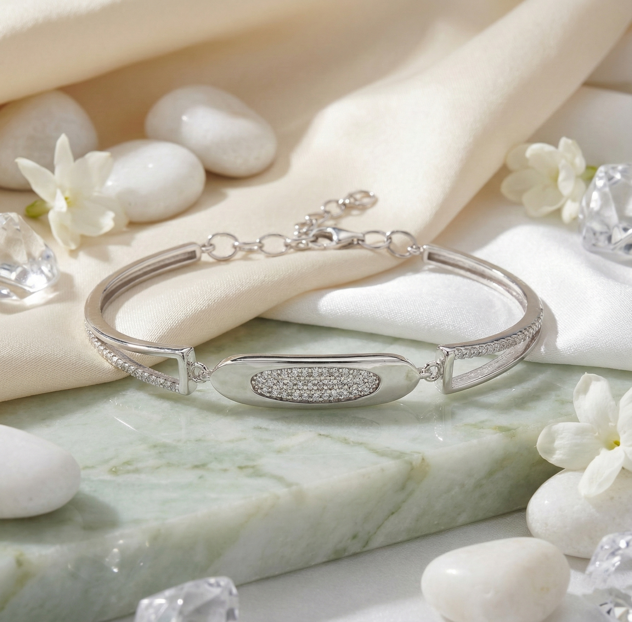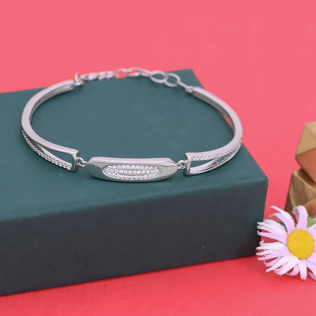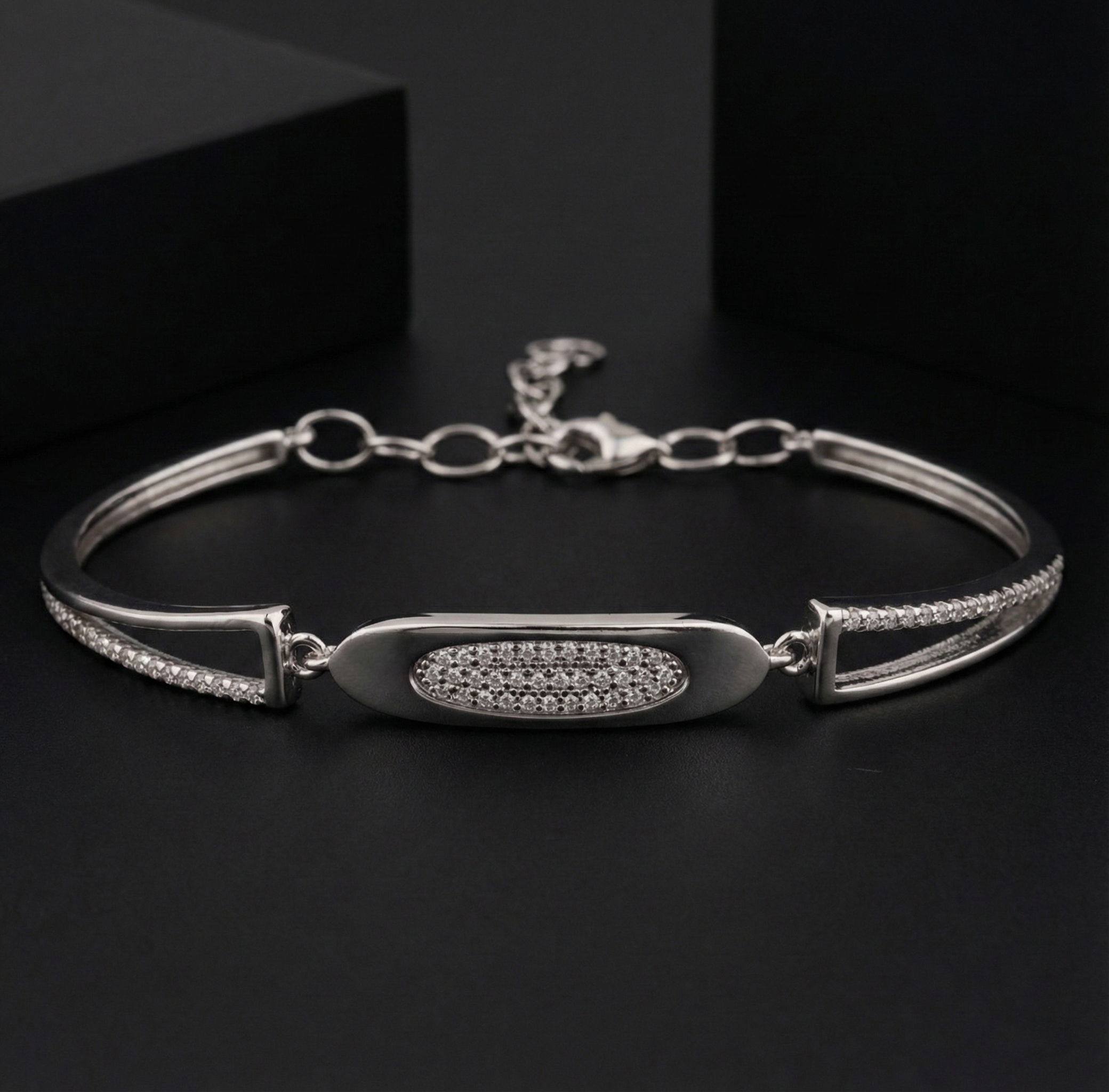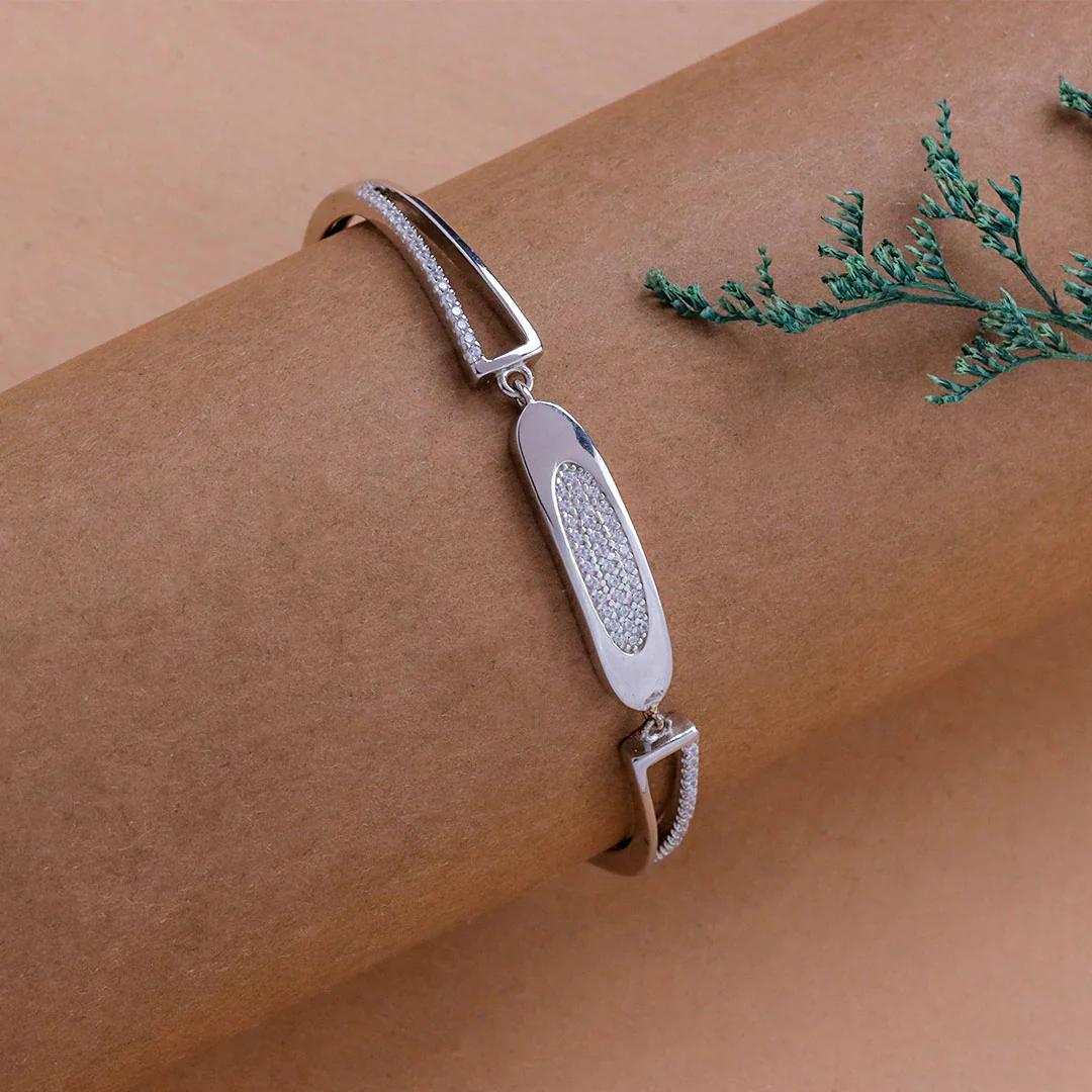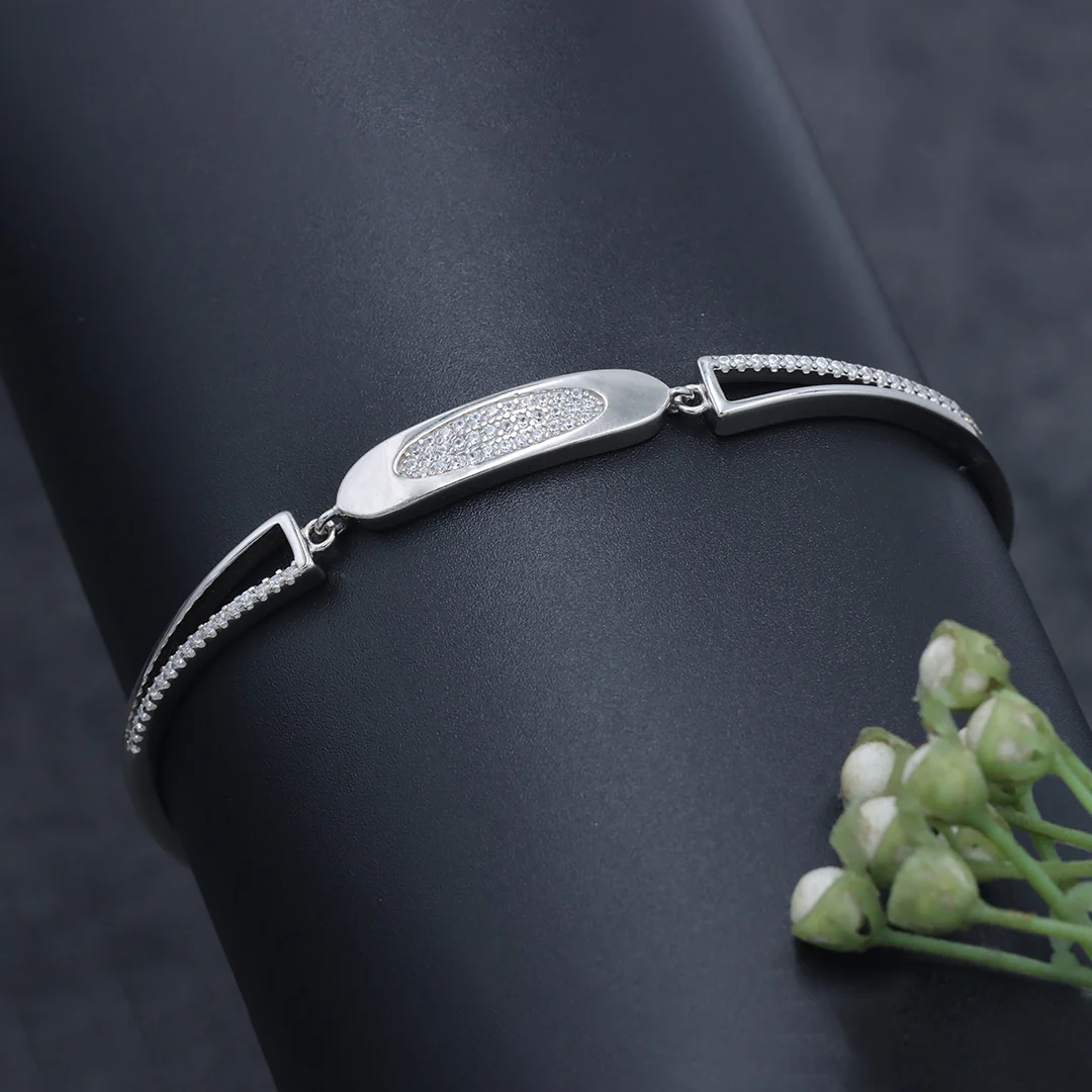 Elevate your everyday elegance with this refined 925 sterling silver bracelet, featuring a striking oval cubic zirconia panel design. Crafted with precision, the lustrous silver complements the brilliant sparkle of premium CZ stones, creating a sophisticated accessory that transitions seamlessly from day to evening. The polished finish and secure construction ensure lasting beauty and durability. Perfect for those who appreciate timeless style with contemporary flair, this bracelet pairs effortlessly with any wardrobe while maintaining an understated luxury aesthetic.