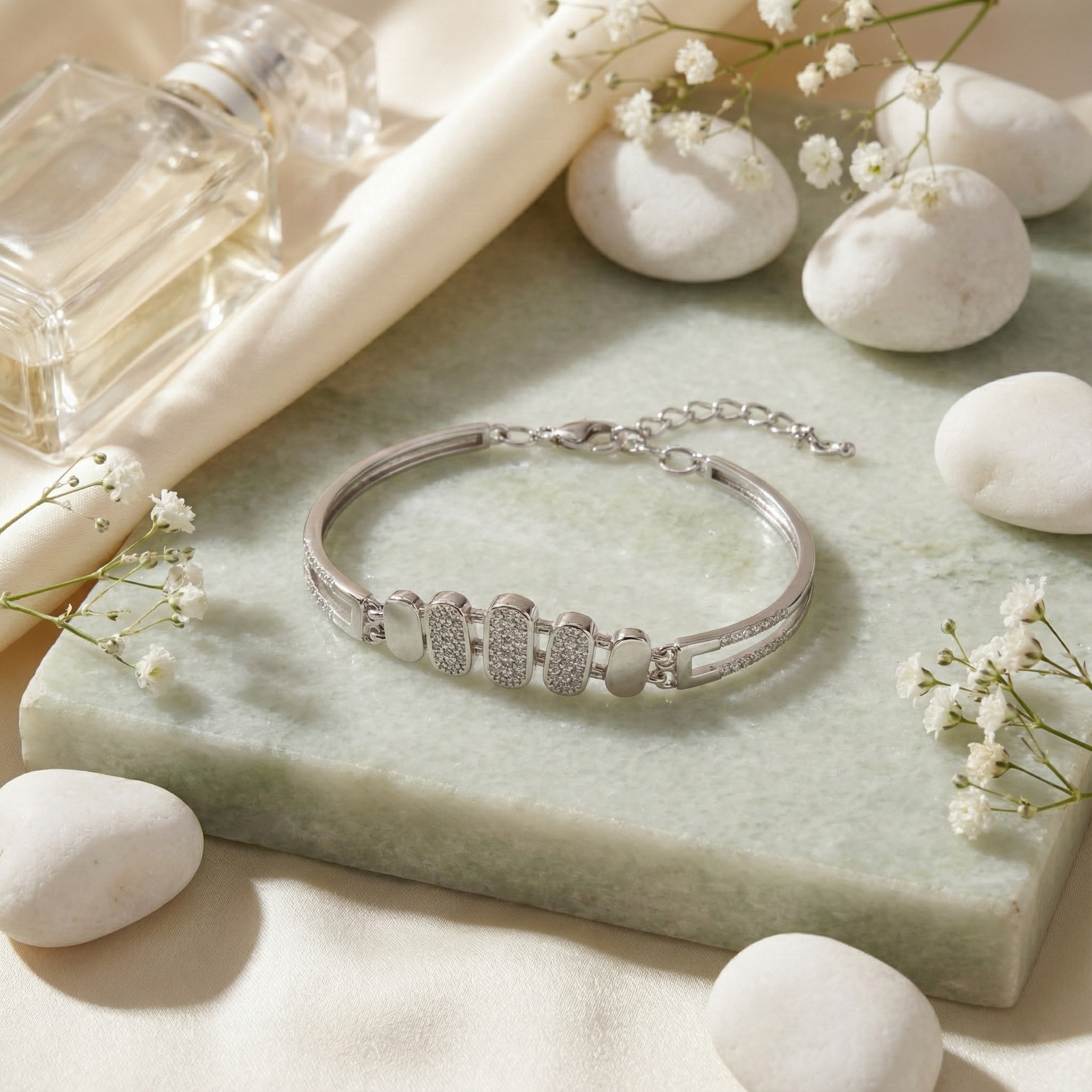 Elevate your wrist with this striking 925 sterling silver bracelet, where contemporary elegance meets timeless craftsmanship. Each oval link showcases intricate pavé-set cubic zirconia stones that catch light with brilliant sparkle, creating a refined yet modern aesthetic. The smooth sterling silver bands provide a sophisticated contrast to the glittering gemstone details, while the secure link construction ensures lasting durability. Perfect for layering or wearing solo, this piece transitions seamlessly from everyday sophistication to special occasion glamour. A versatile addition to any jewelry collection that celebrates understated luxury.