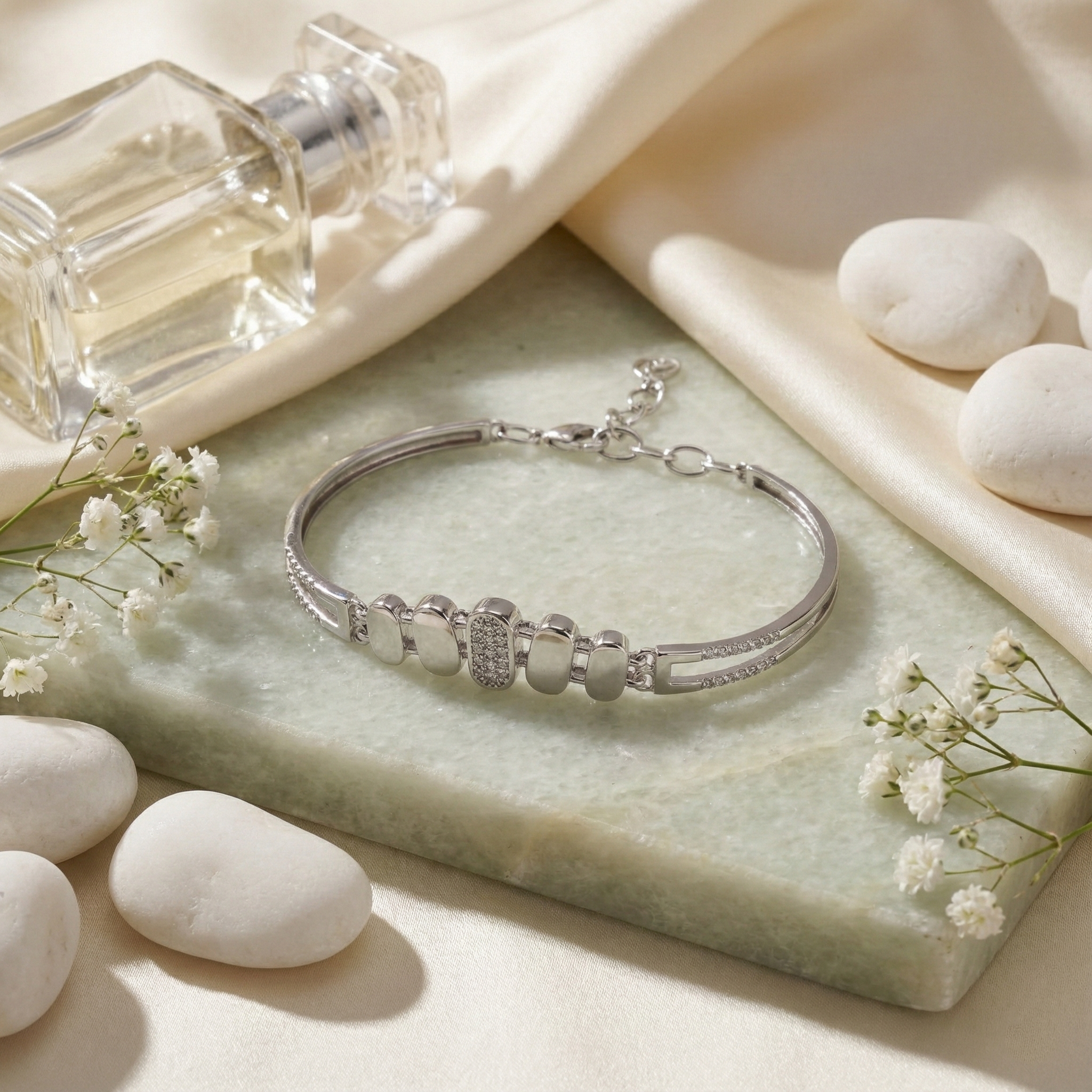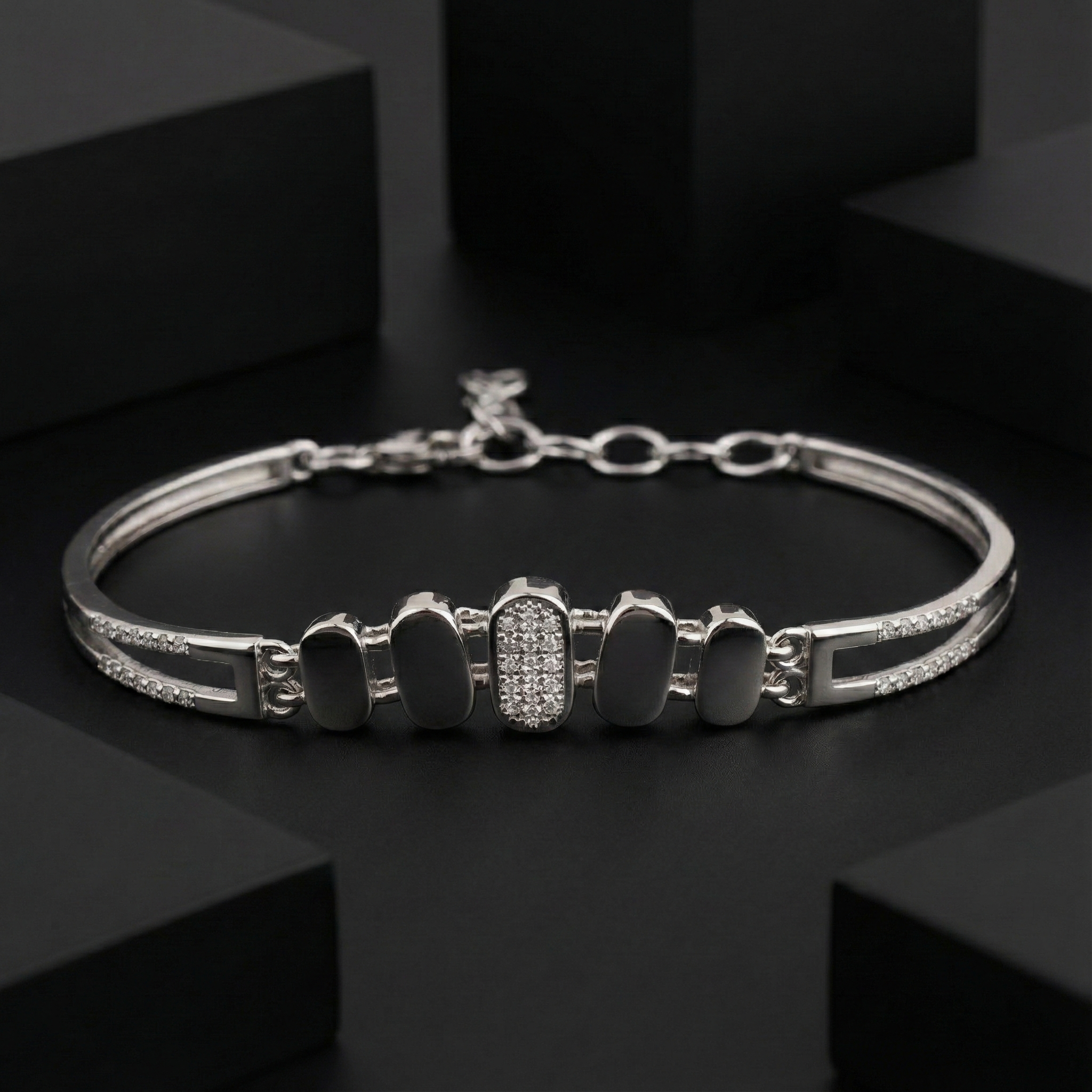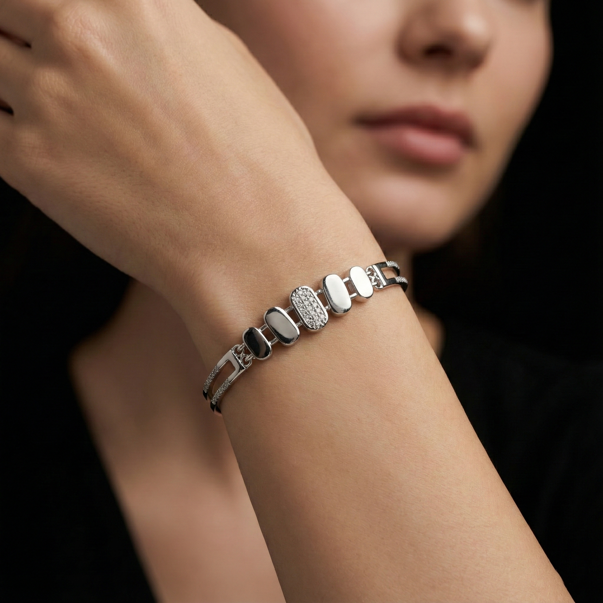 Elevate your wrist with this contemporary sterling silver bracelet, where precision meets elegance. Each oval link showcases meticulously set cubic zirconia pavé stones that catch light with brilliant sparkle, creating a refined geometric aesthetic. Crafted from authentic 925 sterling silver, this piece combines durability with timeless sophistication. The modern design transitions seamlessly from everyday wear to evening occasions, making it a versatile addition to any jewelry collection. A statement of understated luxury for those who appreciate quality craftsmanship and contemporary style.