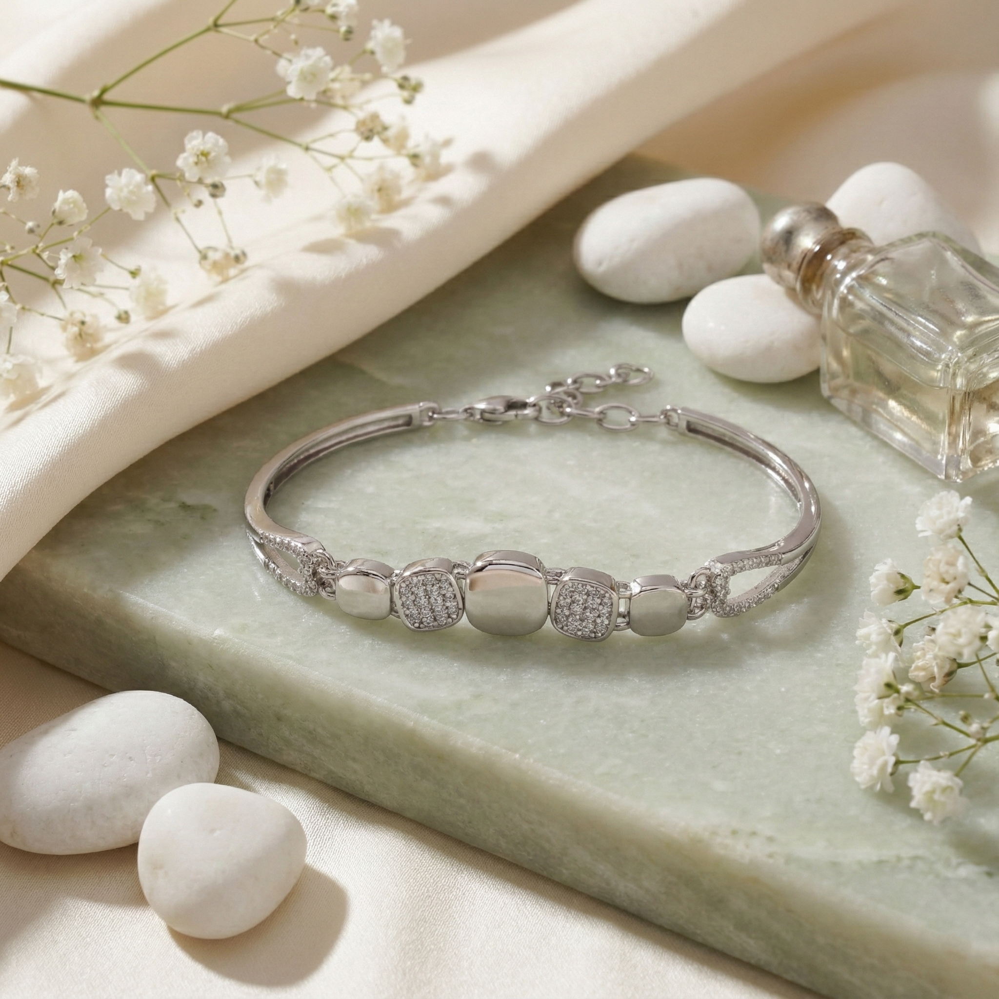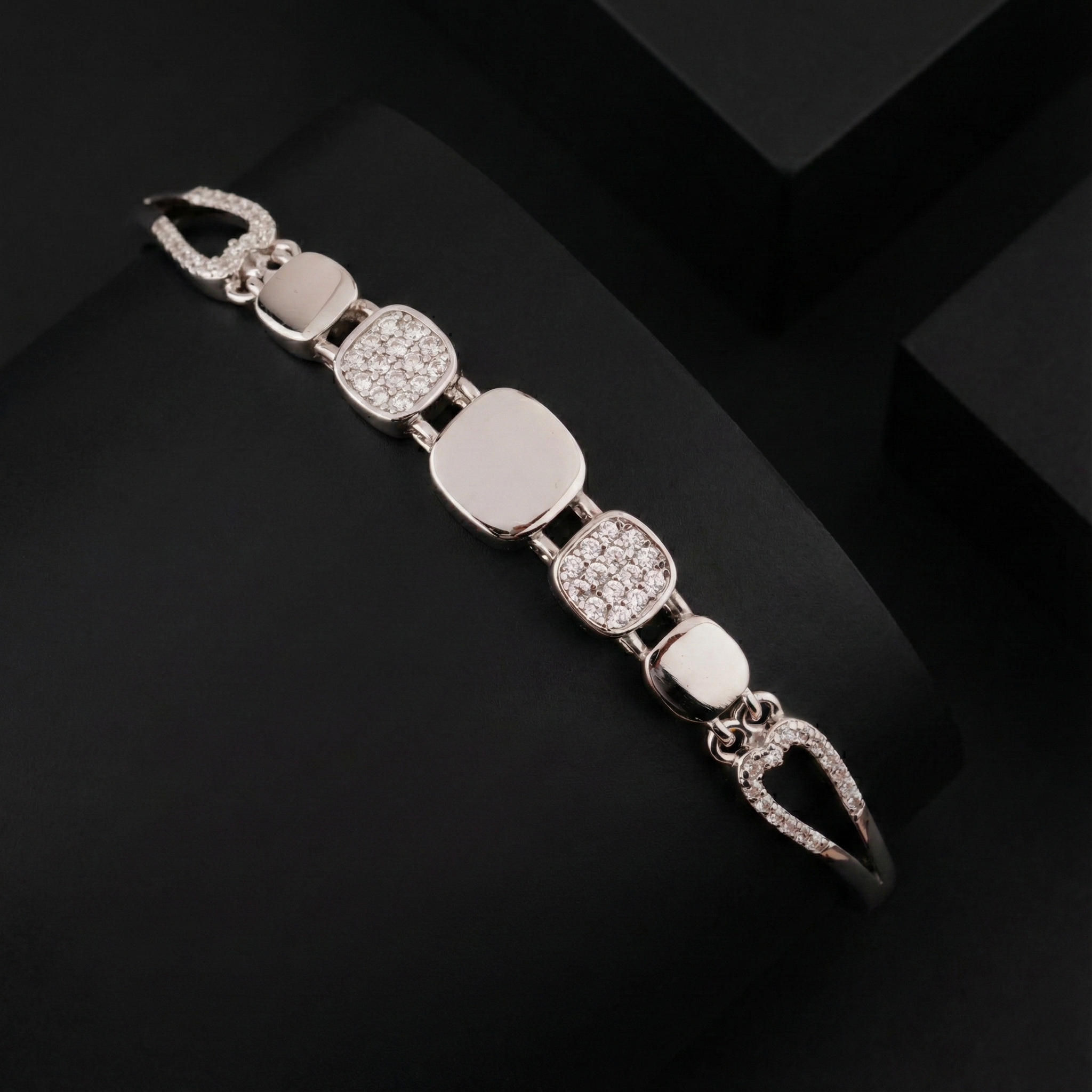 Elevate your wrist with this refined 925 sterling silver bracelet, featuring geometric square links adorned with brilliant cubic zirconia stones. The contemporary design balances minimalist aesthetics with eye-catching sparkle, making it versatile enough for everyday wear or special occasions. Crafted from premium sterling silver, this piece offers lasting durability and a lustrous finish that complements any style. Perfect for those who appreciate modern elegance with timeless appeal.