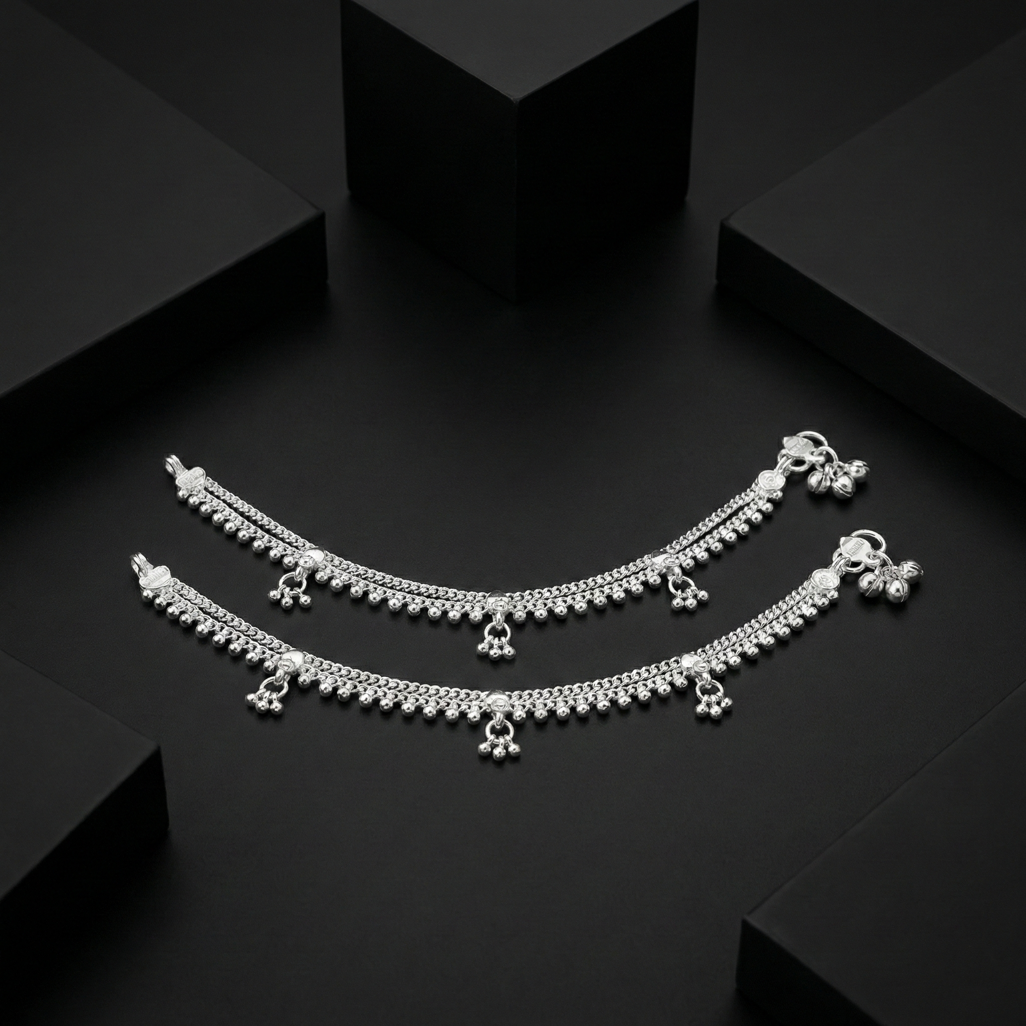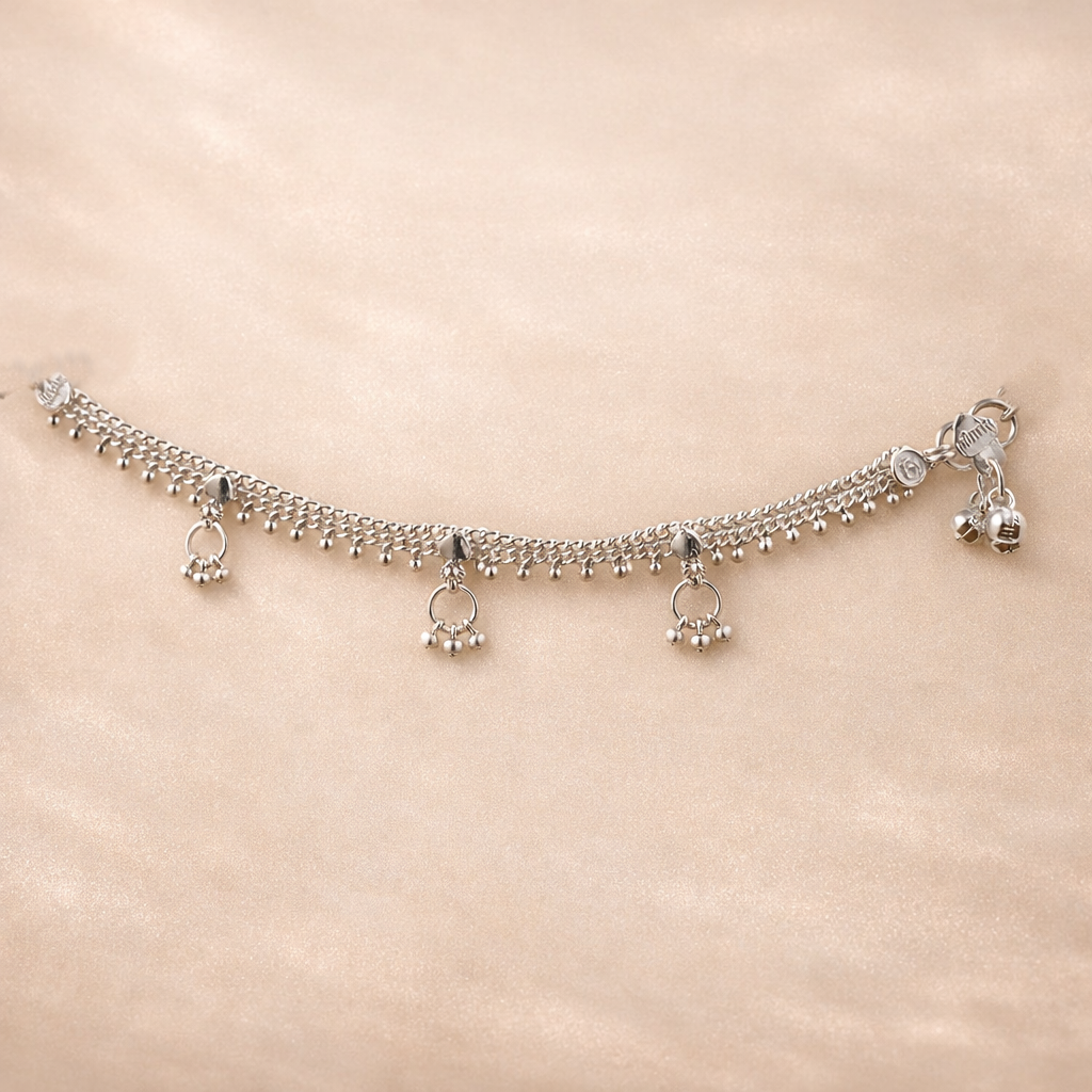 Elevate your ethnic ensemble with this exquisite Silver Dubble Line Hayderabadi Ghughari Boriya, a timeless piece rooted in Hyderabadi craftsmanship. Featuring intricate double-line detailing, this traditional ghughari combines ornate silverwork with authentic design elements that reflect centuries of jewelry-making heritage. Perfect for weddings, festivals, and special occasions, this boriya adds refined elegance and cultural grace to any traditional attire. A sophisticated choice for those who appreciate handcrafted artistry and timeless beauty.