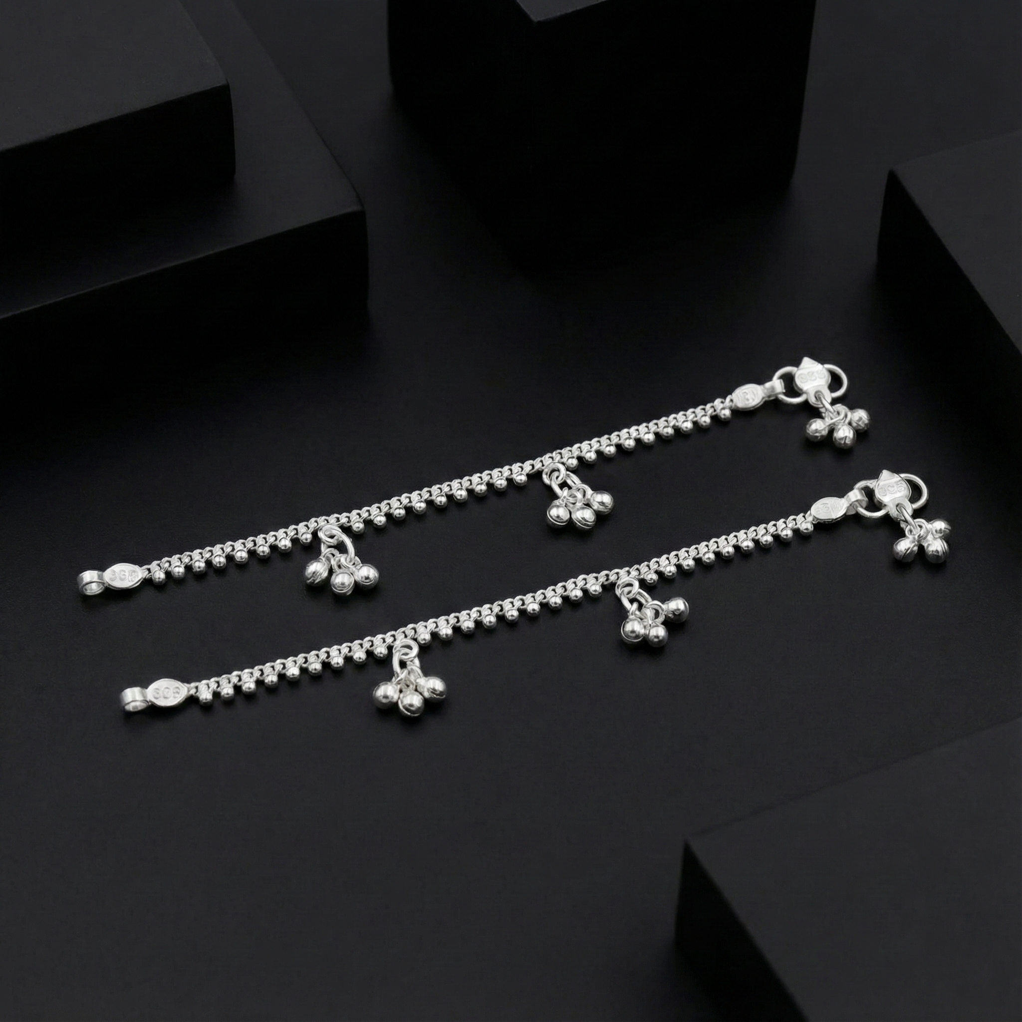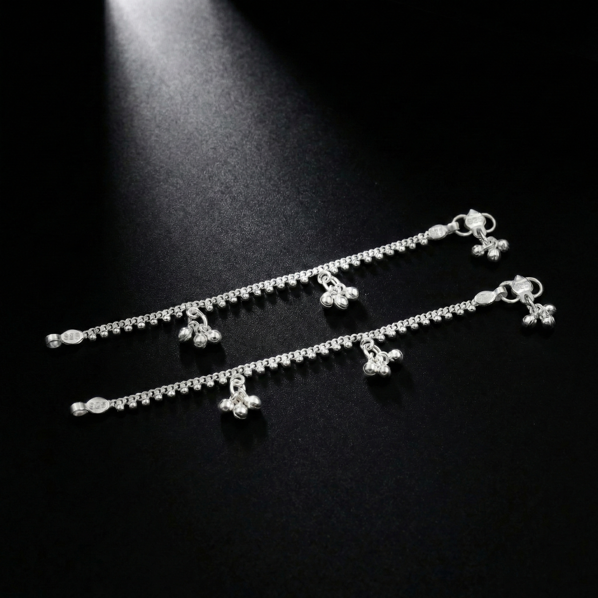 Elevate your traditional ensemble with this exquisite Silver Karap Rava Single Line Ghughri Boriya. Meticulously crafted with premium silver, this single-line ghughri boriya features the distinctive karap rava design, delivering authentic charm and timeless elegance. The delicate ghugri bells create a melodious resonance with every movement, making it an essential accessory for classical dance performances, festive celebrations, and cultural occasions. Perfect for dancers and jewelry enthusiasts seeking refined craftsmanship and genuine silver quality.
