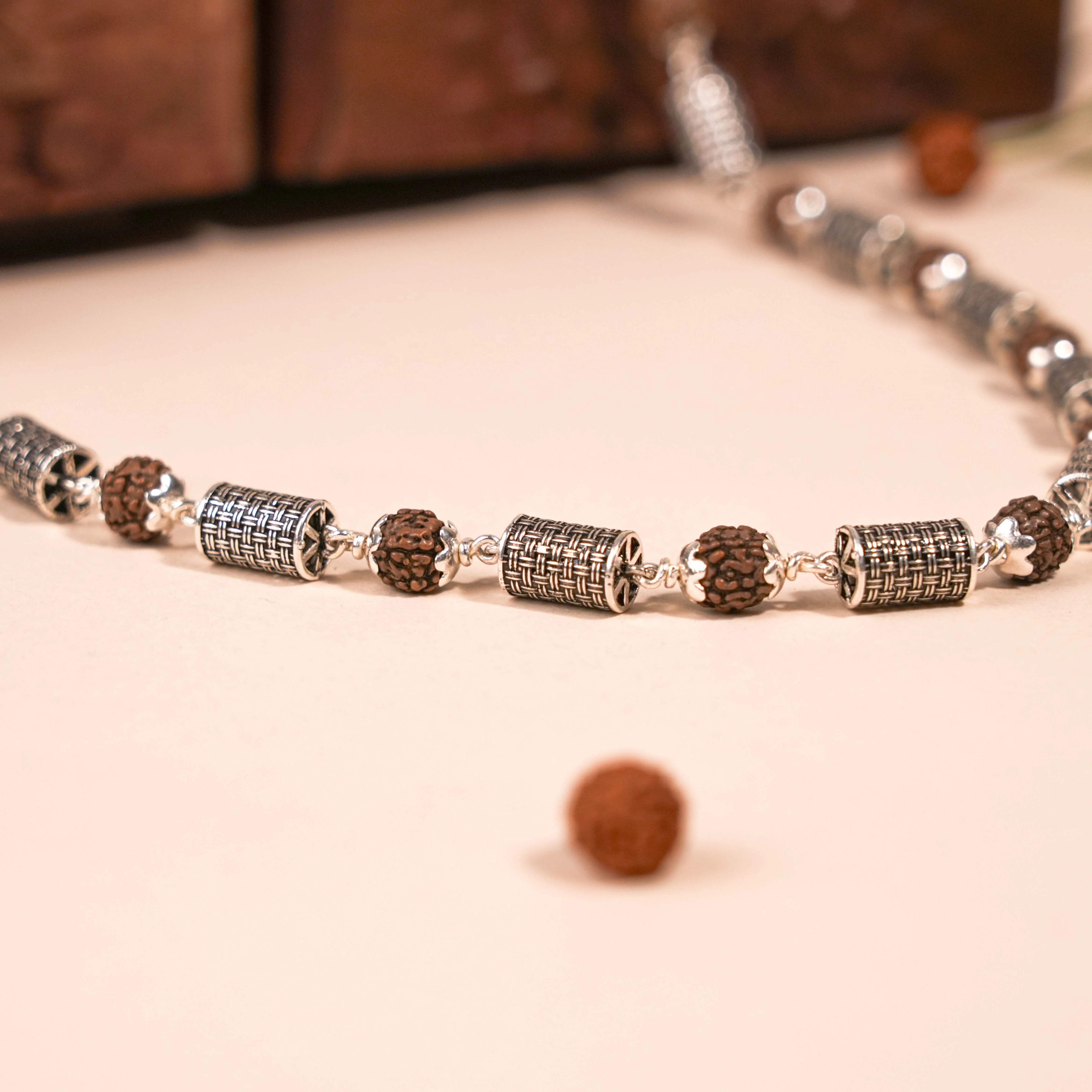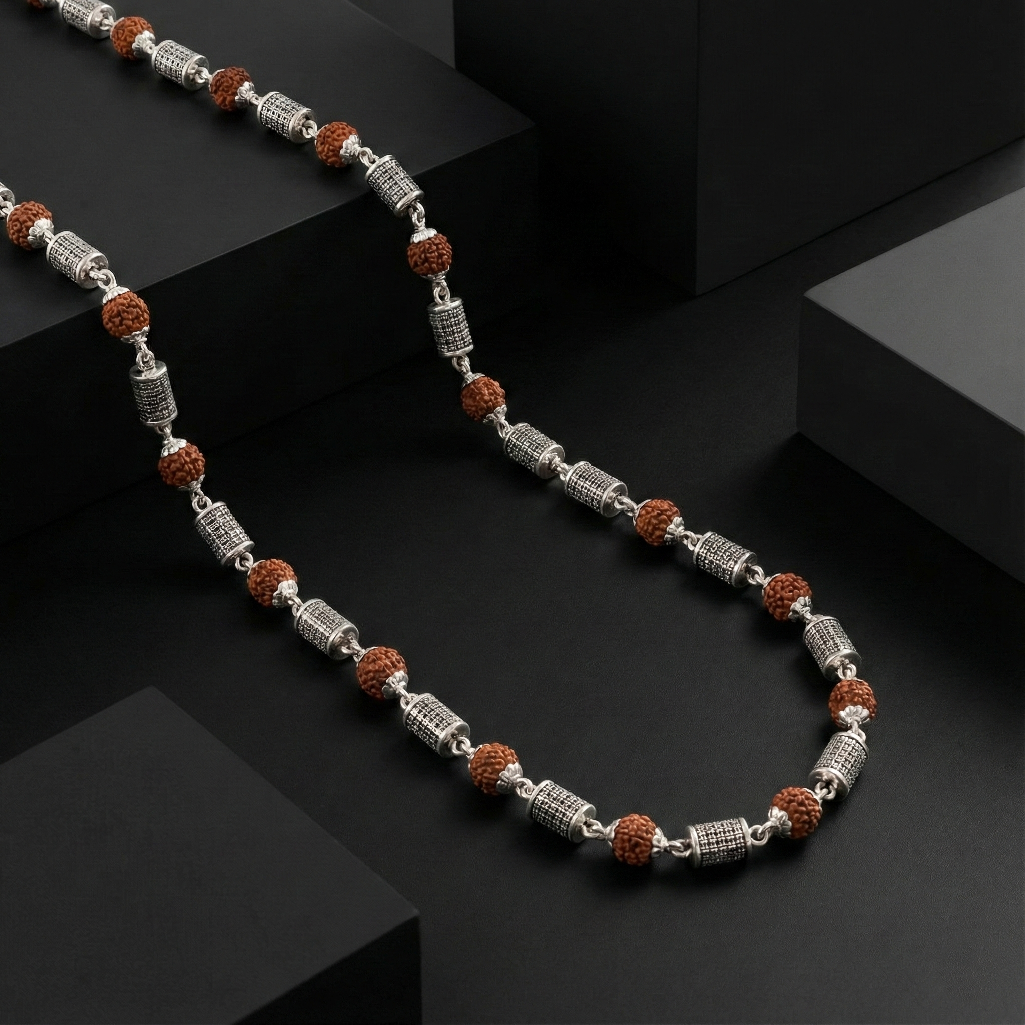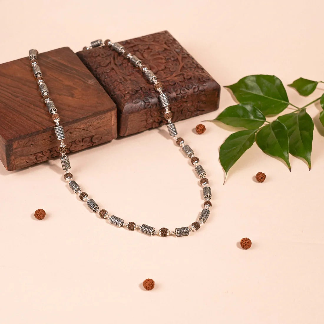 Elevate your spiritual style with this exquisite Silver Rudraksha Beaded Necklace, where sacred tradition meets contemporary elegance. Featuring authentic rudraksha beads paired with meticulously crafted designer cylindrical silver links, this piece seamlessly blends timeless symbolism with modern sophistication. The rudraksha beads, revered in Hindu and Buddhist practices, are complemented by lustrous silver accents that enhance their natural beauty. Perfect for those seeking meaningful jewelry that transcends everyday wear, this necklace serves as both a spiritual accessory and a refined fashion statement. An ideal choice for collectors of artisanal jewelry and spiritual enthusiasts alike.