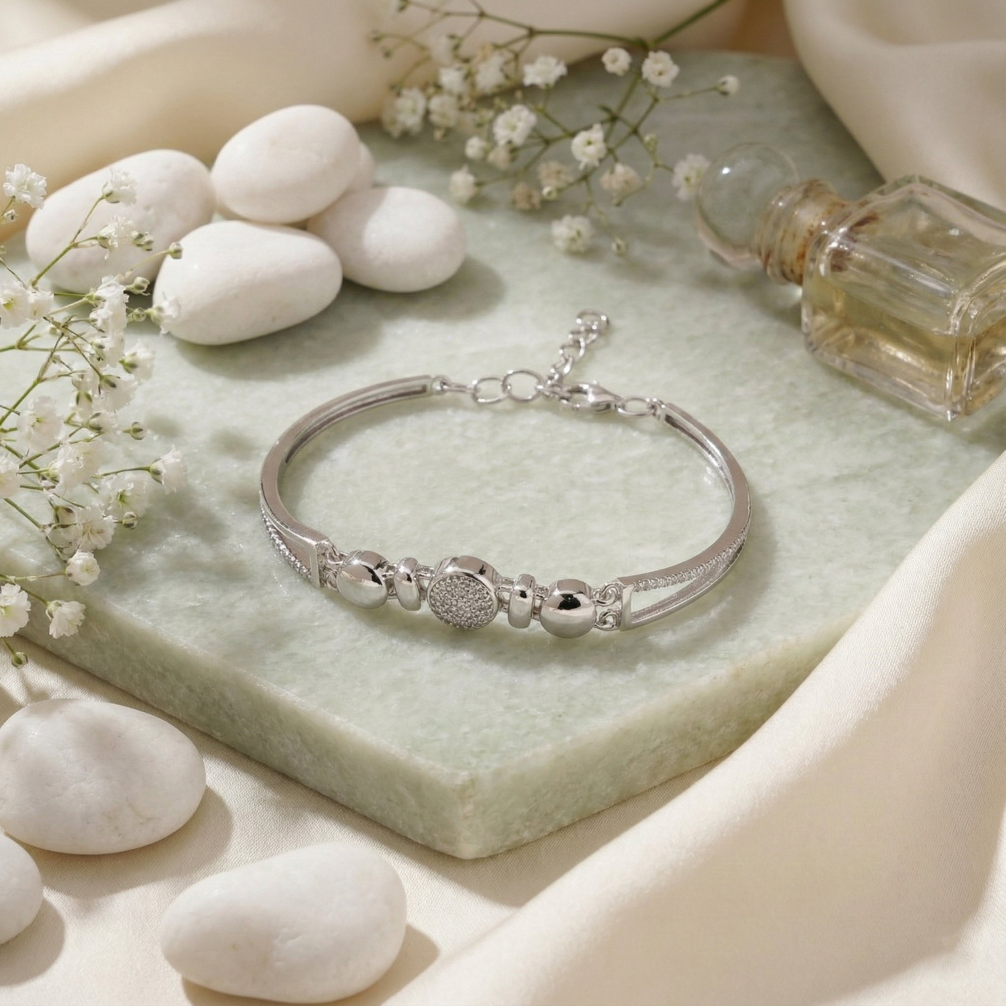 Elevate your everyday elegance with this sterling silver bracelet, featuring brilliant cubic zirconia accents arranged in a refined circular pattern. The sleek contemporary design strikes the perfect balance between modern minimalism and timeless sophistication, making it an ideal companion for both casual and formal occasions. Crafted from premium sterling silver, this piece offers durability and lasting shine. The sparkling CZ stones catch light beautifully, delivering the brilliance of fine jewelry without compromise. A versatile addition to any collection, this bracelet complements virtually any style and pairs effortlessly with other pieces.
