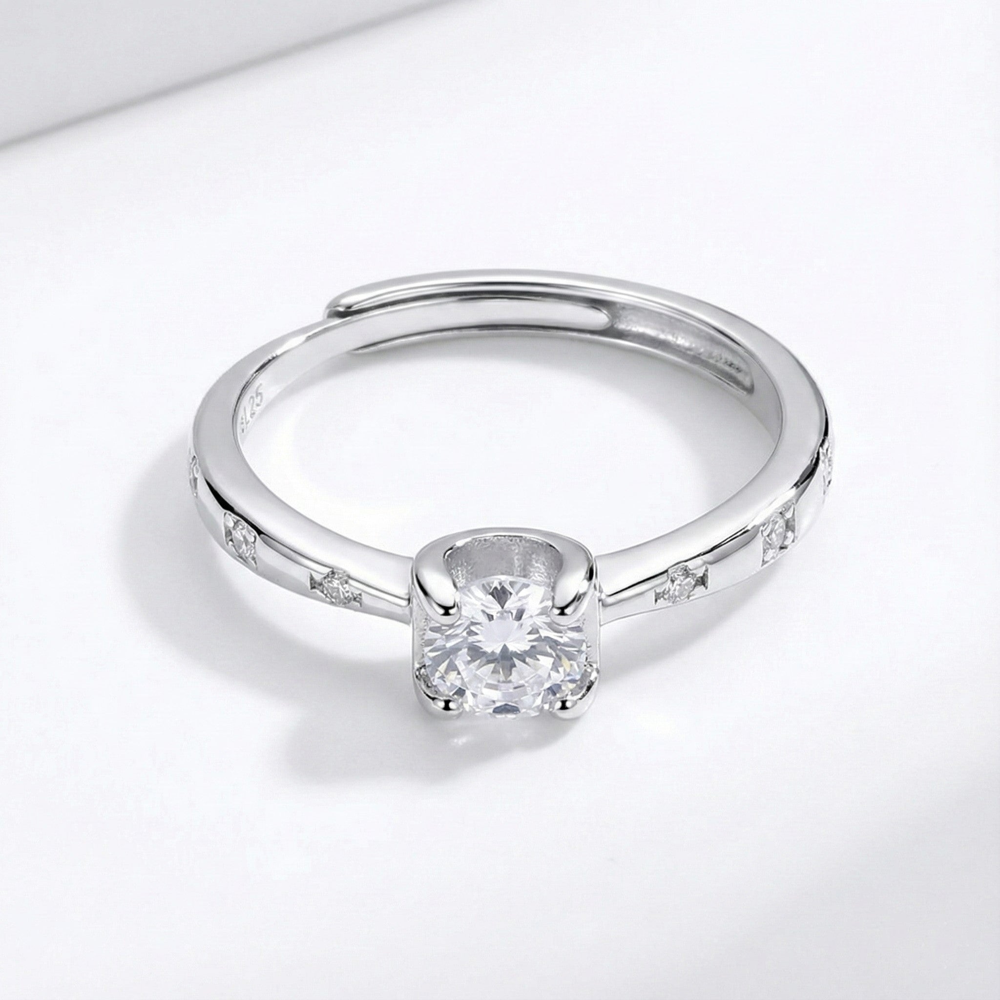 Elevate your engagement with timeless elegance. This sterling silver solitaire ring features a brilliant round-cut cubic zirconia center stone that captures light with exceptional sparkle and clarity. Delicate channel-set side stones frame the centerpiece, creating a refined silhouette that complements any style. Crafted from premium sterling silver, this piece offers the luxury aesthetic of fine jewelry at an accessible price point. Perfect for those seeking a sophisticated, enduring symbol of commitment.