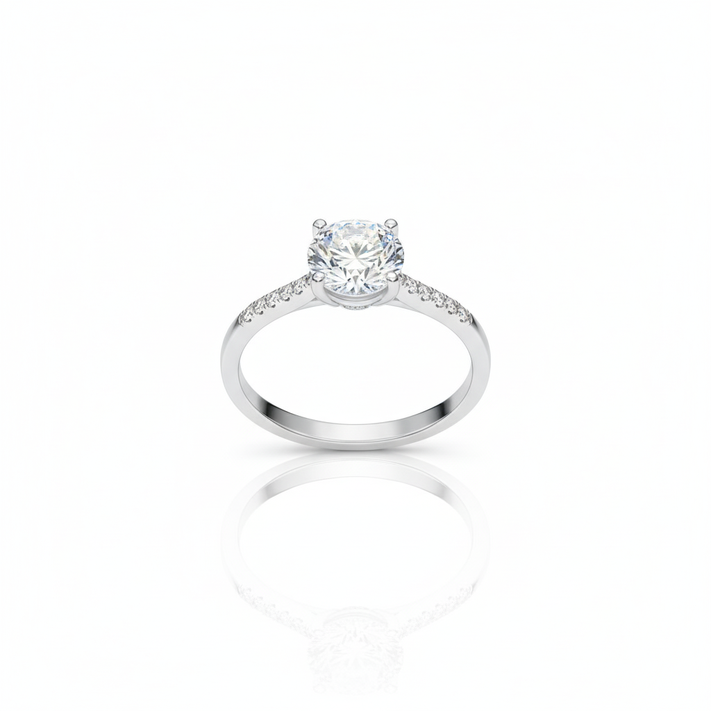 Elevate your engagement with timeless elegance. This sterling silver solitaire ring features a brilliant round cut crystal centerpiece, complemented by a delicately paved band that catches light from every angle. Crafted with precision and refined aesthetics, this classic design symbolizes enduring commitment while maintaining the sophisticated simplicity that transcends trends. Perfect for those who appreciate understated luxury and lasting beauty.