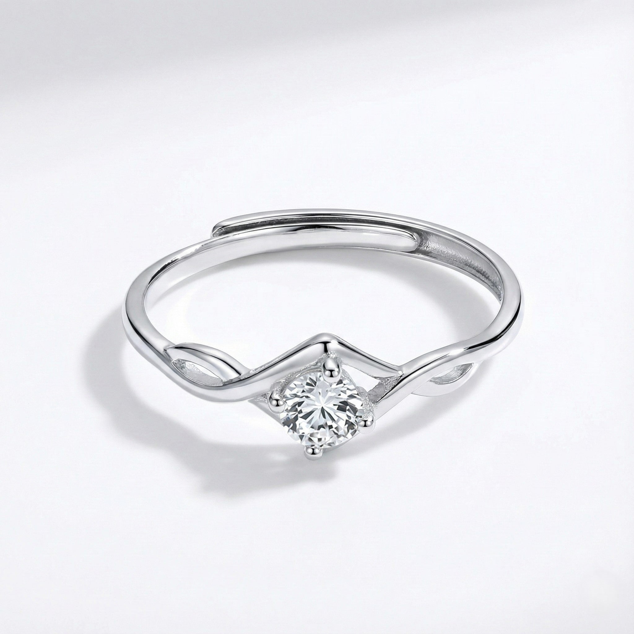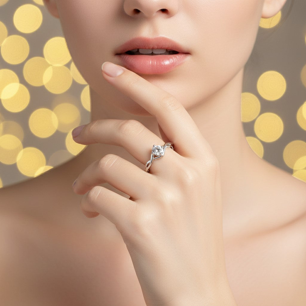 Elevate your engagement with this striking sterling silver solitaire ring, where timeless infinity symbolism meets contemporary elegance. The twisted band design creates a dynamic interplay of light and shadow, while a brilliant cubic zirconia stone commands attention at the center. Crafted from premium sterling silver, this modern band seamlessly transitions from engagement to everyday wear. Perfect for those who appreciate refined aesthetics and meaningful design.